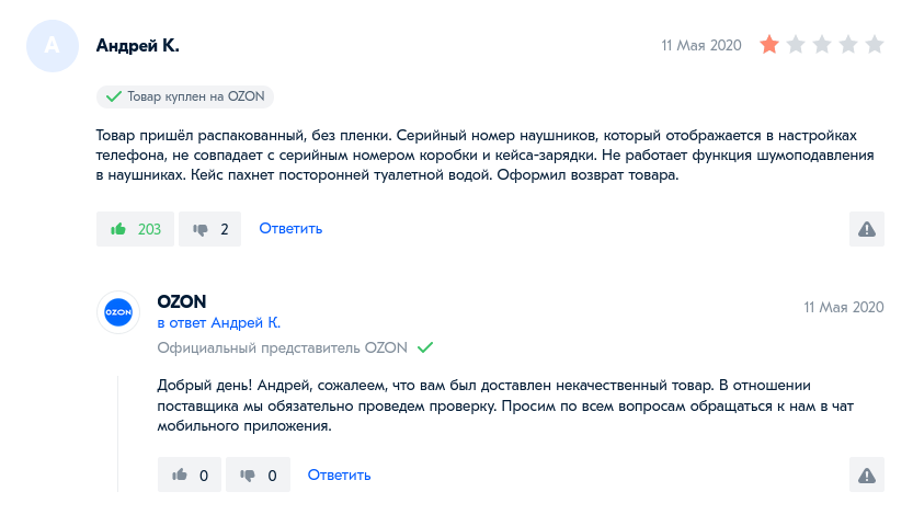Но бывает и хуже. К примеру, подозреваю, в этом случае, человек просто не догадался, что ему досталась подделка, и просто смирился с низким качеством. Я не знаю, чем там все закончилось (официальный ответ магазина к этому отзыву отсутствует), но вполне возможно, что человек просто довольствуется тем, что получил, заплатив довольно большие деньги, обвиняя Apple. Почему Озон не реагирует на подобные отзывы, предлагая человеку проверить подлинность техники?