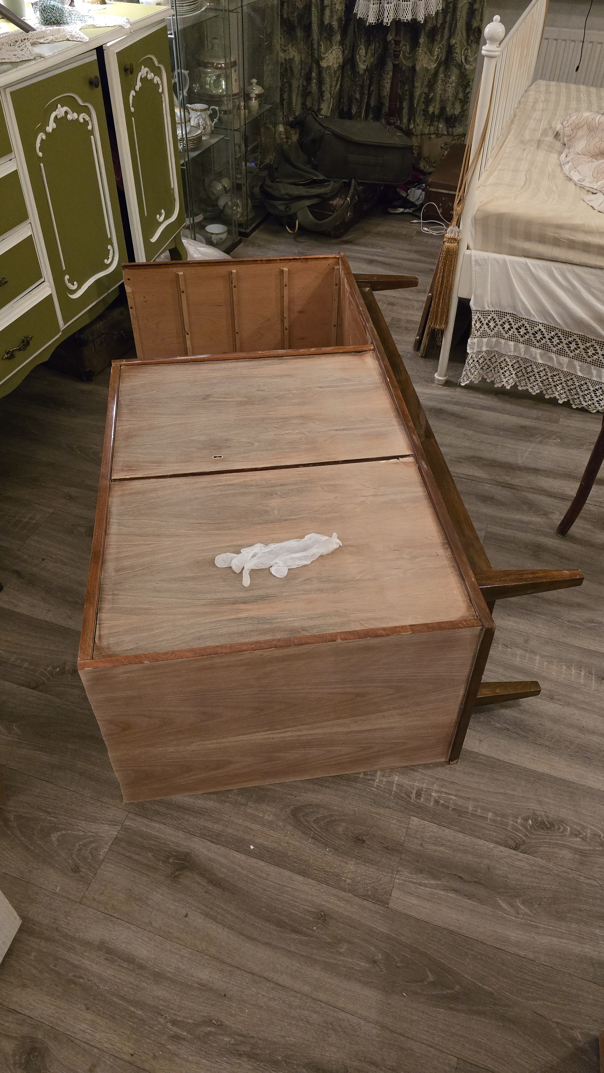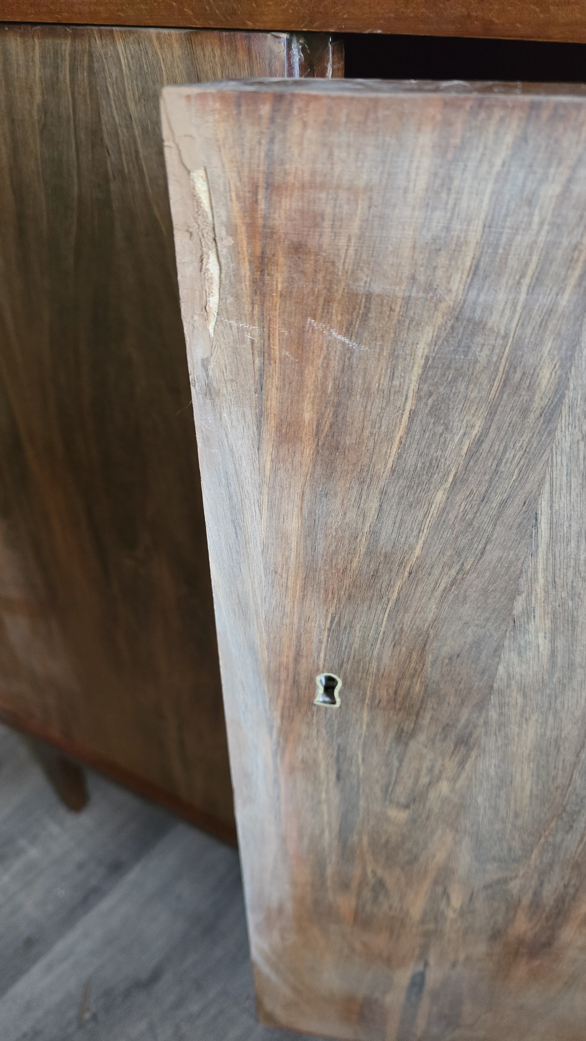 Дома я начала читать форумы и публикации по реставрации мебели времен СССР. Дело в том, что покрытия разные производители использовали разные. Так вот если экземпляр из Румынии 70х, то на нем роскошный ореховый шпон (эх, не экономили же люди!), покрытый плотным миллиметровым слоем полиэфирного лака. Который давал ту самую «шикарную» полировку, ради которой ночами выстаивали советские люди очереди у мебельных магазинов.