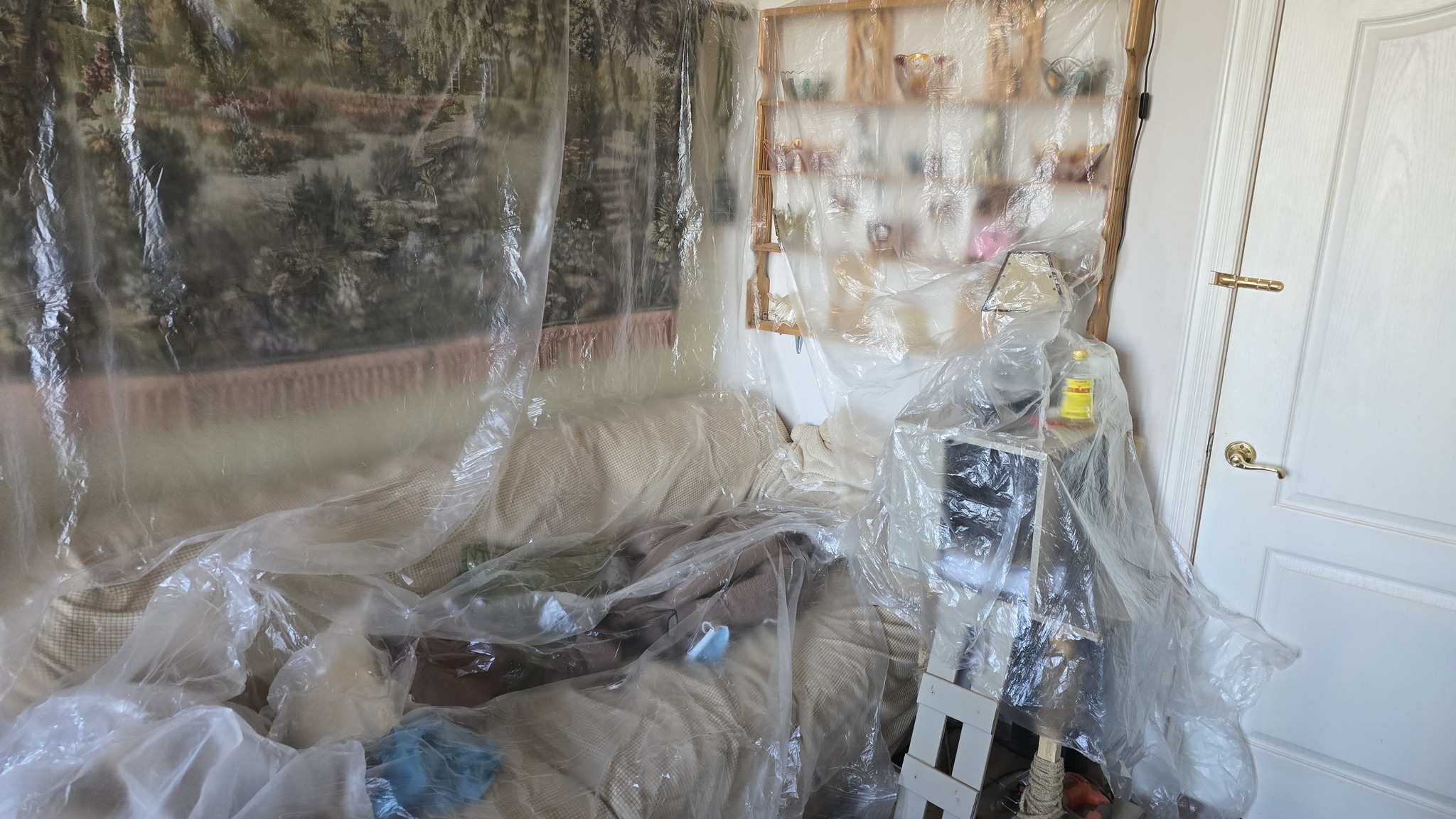 Работа это очень пыльная, поэтому вся комната превратилась вот в такую «слюдяную» пещеру - я закрыла все стены и мебель плёнкой. И все равно часть пыли просочилась, пришлось делать влажную уборку тоже. На лице, естественно, респиратор, на руках перчатки. Но результат порадовал, шпон предстал в первозданном виде.