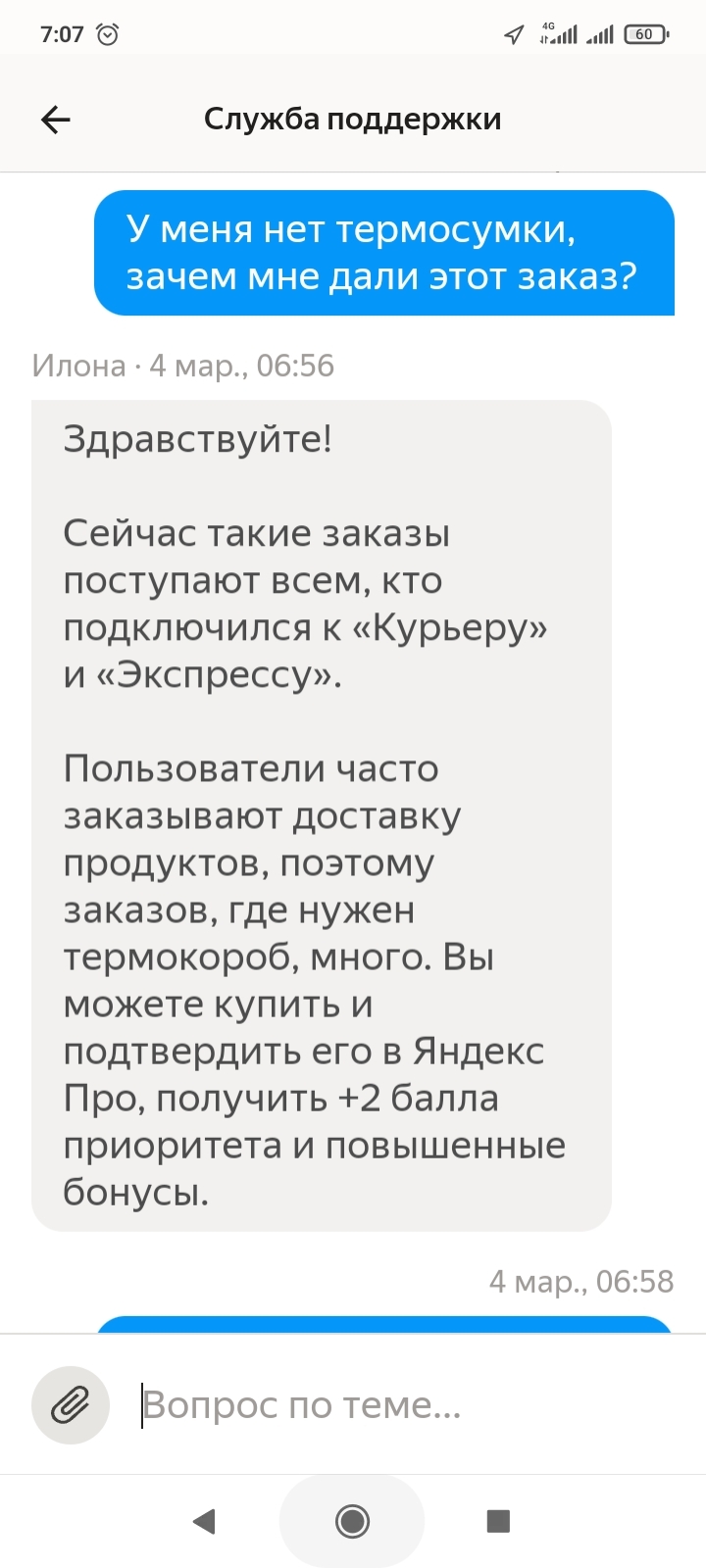Яндекс неожиданно выдал заказ. С термосумкой, которой у меня отродясь не было, и получается выполнить заказ надлежащим образом я не могу, отменить заказ сам могу, но снимут баллы активности, а сотрудники поддержки могут его отменить, когда их не просили, но не могут, когда их об этом просишь