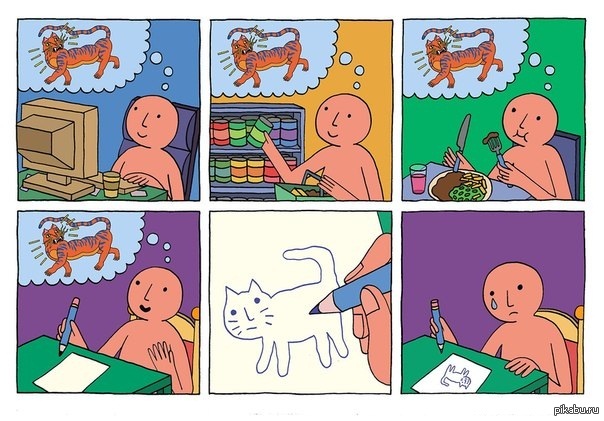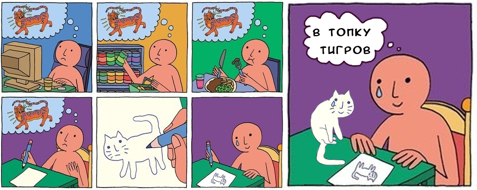В кривонарисованном комиксе кривонарисованный чувак хочет нарисовать кривонарисованного тигра с голубыми полосками и вместо этого у него получается кривонарисованный он сам в образе кривонарисованного кота - а слеза у него от радости навернулась. Мне нравится +