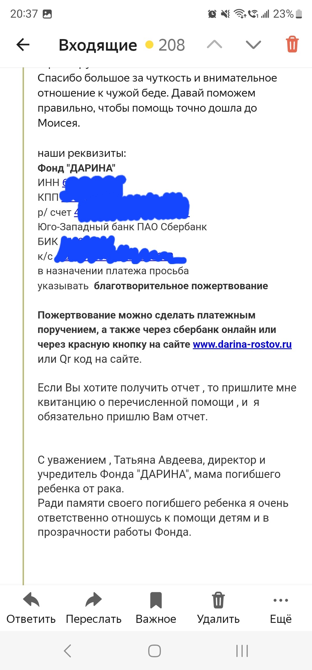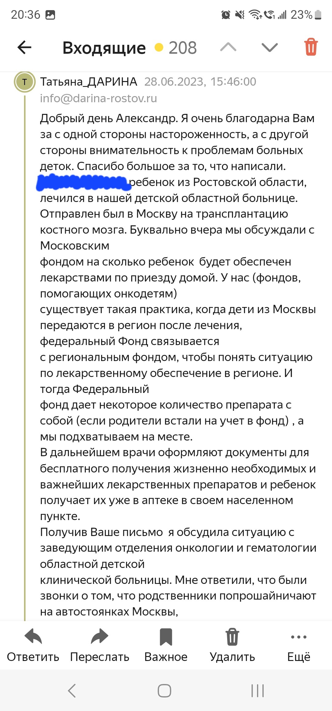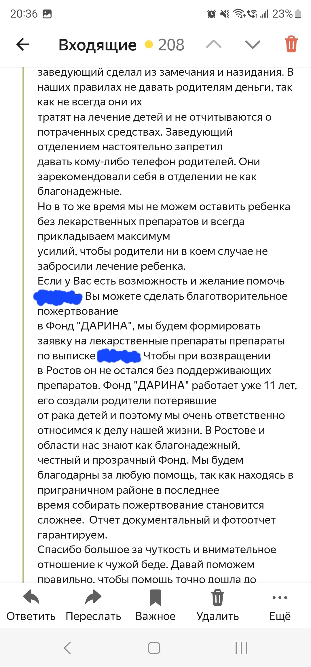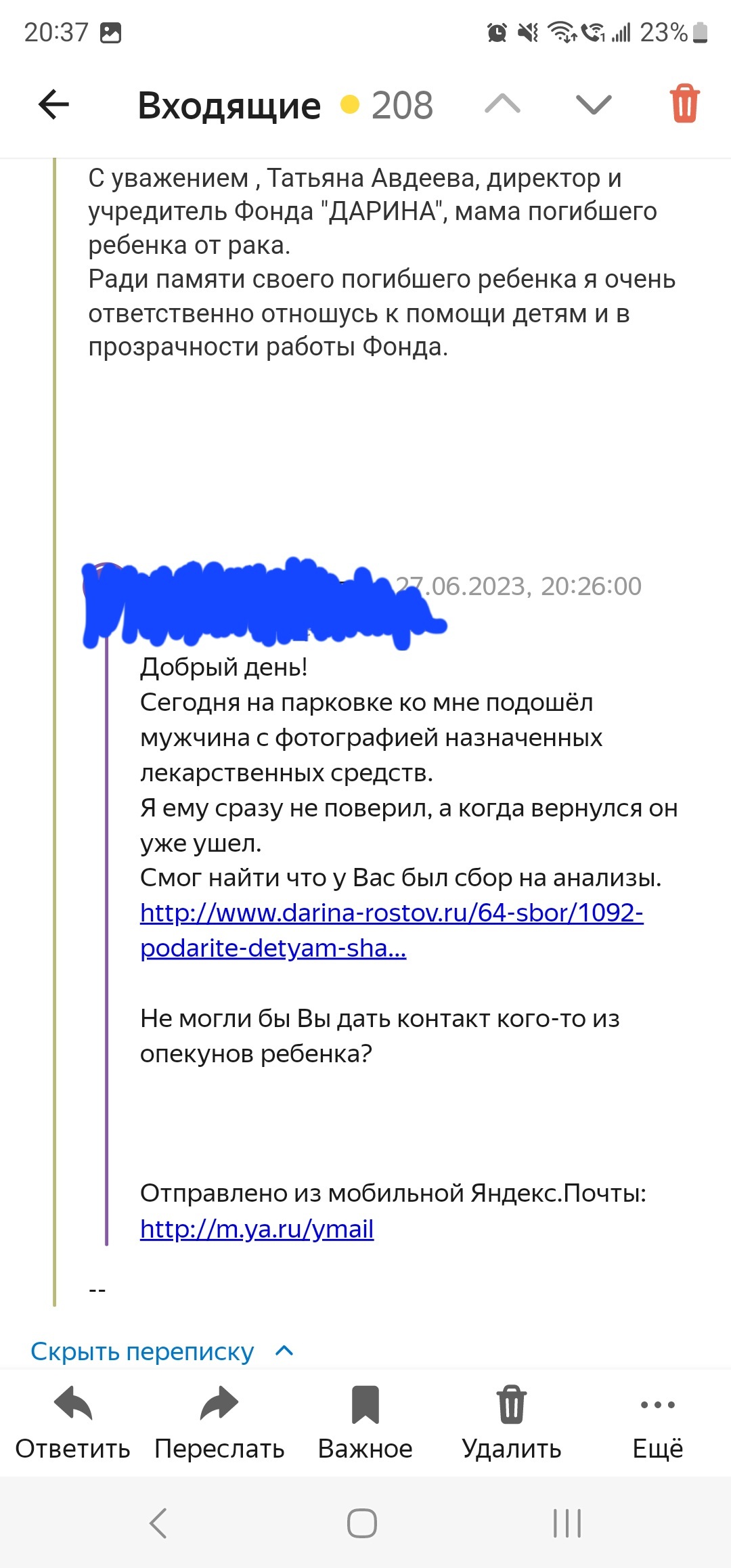 Остановился на парковке перед магазином. К автомобилю подошёл мужчина, сказал, что сам он из Ростова, ребенок его сильно болен, собирает как может деньги на лекарство. Я ему сразу не поверил, потому как фотография списка лекарств с ФИО не внушала доверия. Сказал что схожу в магазин и вернусь, там и переведу. (Не люблю когда меня стоя над душой просят перевести деньги) Когда вернулся к машине, мужчины нигде не было. Уже было подумал, что очередной разводила, коих много, но червяк сомнения не утихал. Прошерстил интернет и смог действительно найти сбор средств на анализы для ребенка от фонда. Написал в фонд. В ответ получил сообщение.