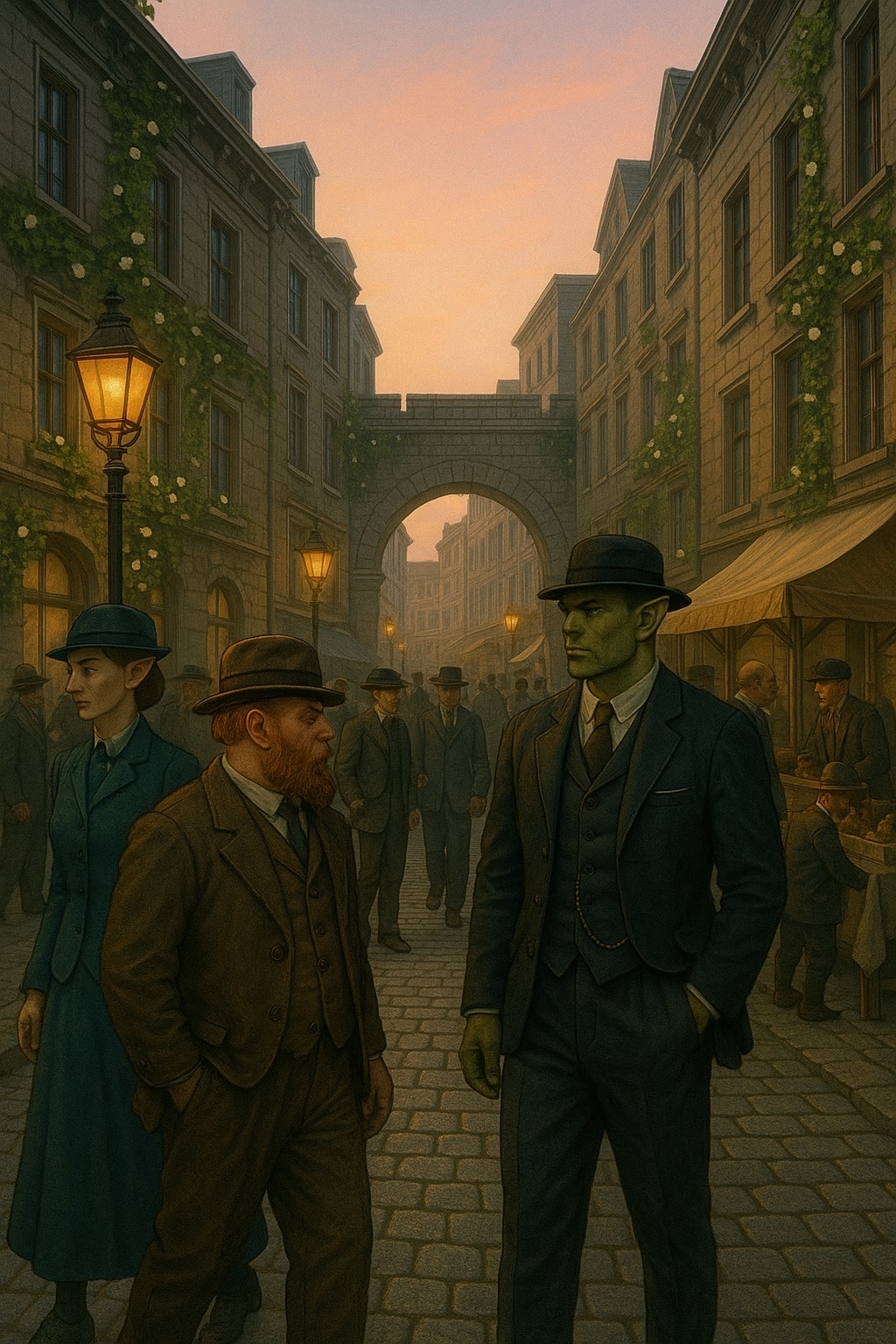 Наконец свернув с аллеи, человек вновь вернулся к шуму торговых палаток и ряду таверн. По улочкам бродили всё те же люди, орки, эльфы, гномы. Всё так же вокруг раздавались крики с предложением купить чего-нибудь, что-нибудь выпить, поесть или еще чего по горячее. Человек устало фыркнул, он без того опаздывал, а народу вокруг становилось всё больше, отчего было уже не протолкнуться. Зачастую у переулков у стен зданий тут и там стояли крепкие парни разных рас, одетые в модные темные костюмы, лакированные туфли и шляпы, либо кепки. Они то и дело поглядывали на часы, курили дорогие сигареты и осматривались по сторонам. То были парни из различных уличных группировок, покровительствующих местным торговцам. Городская стража проявляла большую активность в верхних кольцах города. Здесь же, внизу, правили банды. Но в то же время они с легкостью сотрудничали с местными властями. Отчего коррупция в нижней части города процветала, как нигде больше.