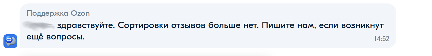 У Вайлдбериса платный возврат брака, у Я-Маркета обман с ценами, а у Озона вот такой тревожный первый звоночек. На этом месте была сортировка отзывов. Иииии.... её нет:
