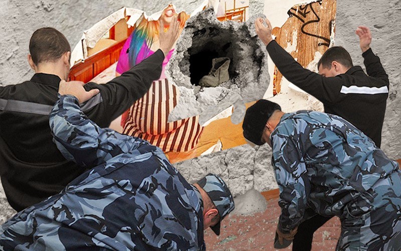 Прибывшая на место группа оперативного расследования, разорвала плакат, за которым находилось большое отверстие диаметром 70 сантиметров, являющееся началом свежевырытого тоннеля вглубь стены.