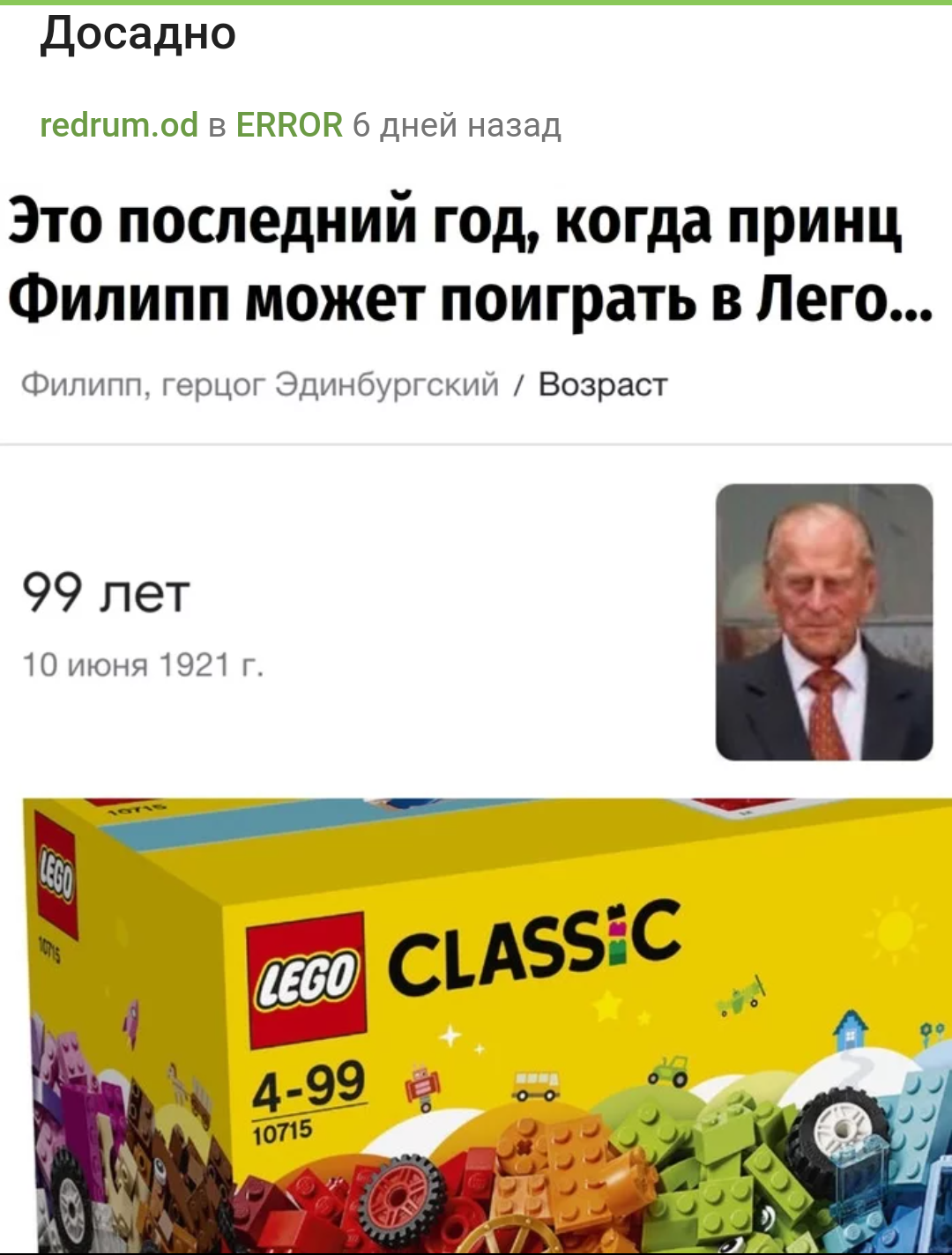 6 RoninKHV И это была правда 4 года назад Умер принц Филиппhttps://m.lenta.ru/news/2021/04/09/filip/ Принц Филипп Англия Новости Смерть 1 1 Ещё 0