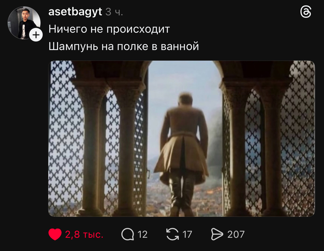2055 Renya52 6 дней назад И это всегда происходит ночью Скриншот Юмор Threads Шампунь Игра престолов 229 4 Ещё 0
