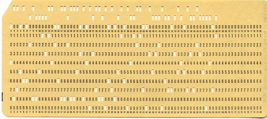 Карты табулятора Холлерита были размером в долларовую бумажку. На каждой карте имелось 12 рядов, в каждом из которых можно было пробить по 20 отверстий, соответствующих таким данным, как возраст, пол, место рождения, количество детей, семейное положение и прочие сведения, включенные в вопросник переписи американского населения. Агенты, проводившие перепись, записывали ответы опрашиваемых в специальные формуляры. Заполненные формуляры отсылались в Вашингтон, где содержащуюся в них информацию переносили на карты путем соответствующего перфорирования. Затем перфокарты загружали в специальные устройства, соединенные с табуляционной машиной, где они нанизывались на ряды тонких игл.