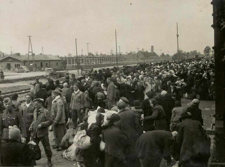 Отбор людей на входе в Аушвиц 1944, офицеры СС отбирают тех кто умрет сразу, кого использовать рабом или для медициснких экспериментов. Вход в главный крпус на заднем плане. Точное количество погибших в лагере не установлено. Между 1,1 и 1.6 миллионов людей; примерно 90% погибших были евреи.