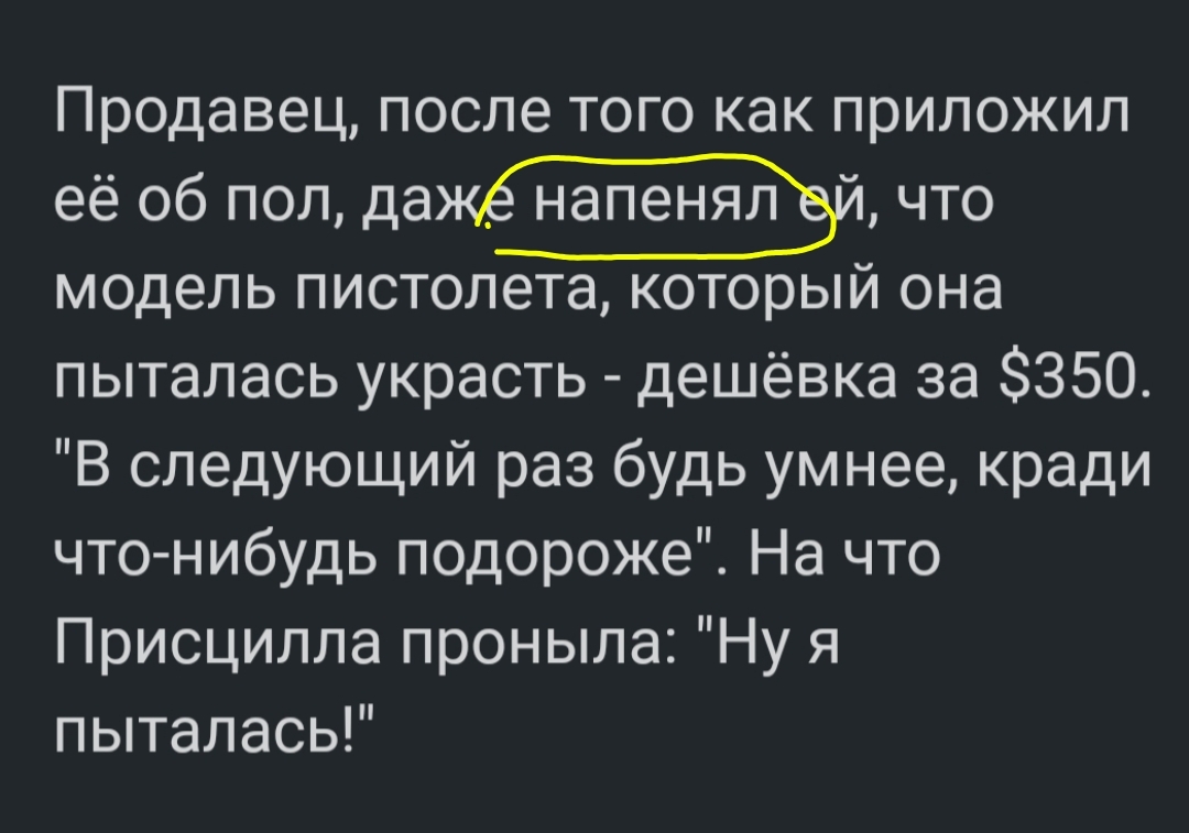 Продавец, после того как приложил её об пол, даже напенял ей, что модель пистолета, который она пыталась украсть - дешёвка за $350. "В следующий раз будь умнее, кради что-нибудь подороже". На что Присцилла проныла: "Ну я пыталась!"