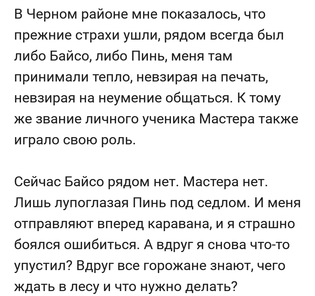 Сейчас Байсо рядом нет. Мастера нет. Лишь лупоглазая Пинь под седлом. И меня отправляют вперед каравана, и я страшно боялся ошибиться. А вдруг я снова что-то упустил? Вдруг все горожане знают, чего ждать в лесу и что нужно делать?