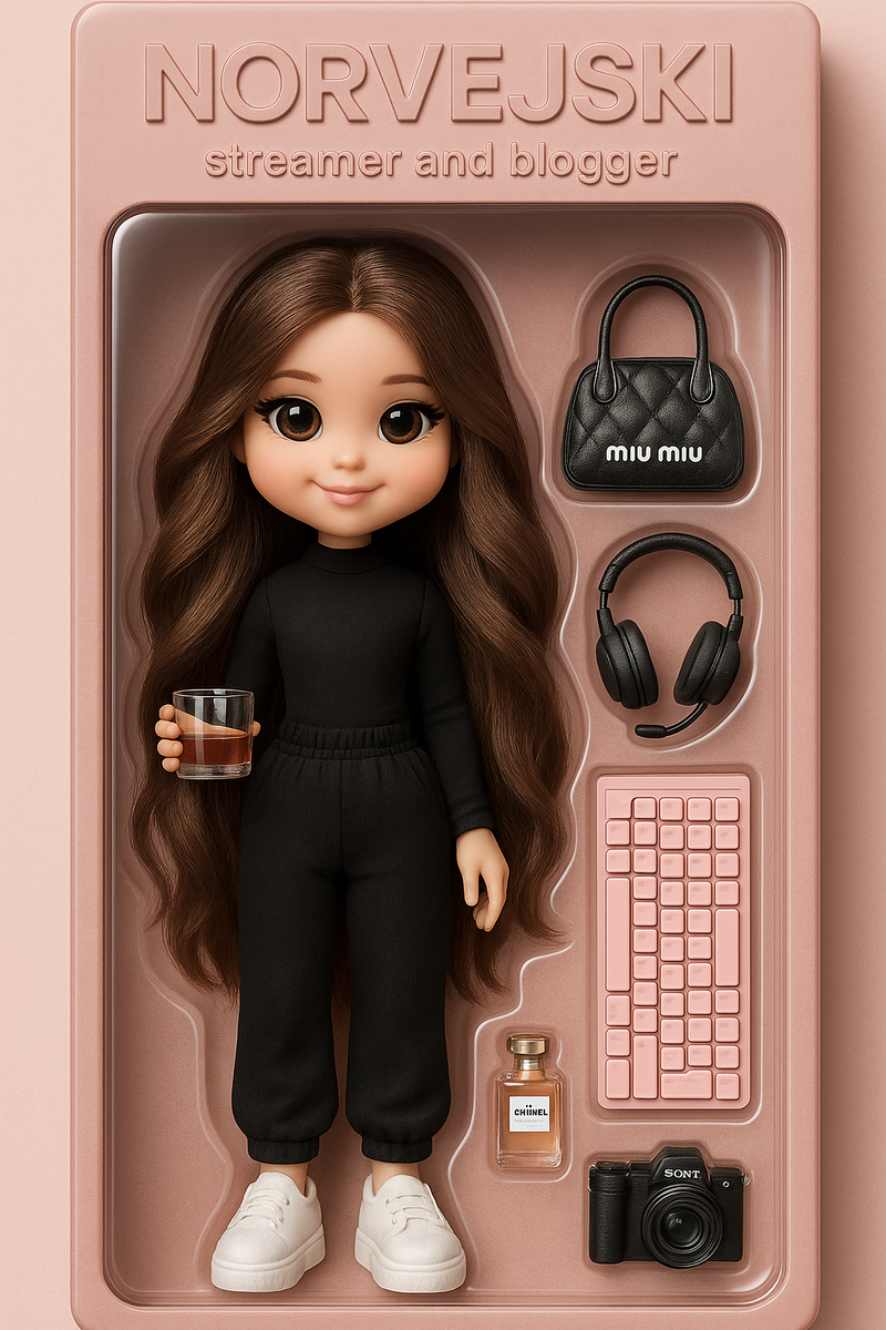 Стиль коробки современный. Коробка: прозрачный пластик спереди, картон сзади. Цвет (указывайте свой). Вверху коробки должно быть написано имя персонажа (пишете имя и например деятельность) — буквы впечатаны и выгравированы на коробке. Аксессуары внутри коробки: Разложены рядом с куклой по своим местам в отдельных ячейках: (тут пример того что можно добавить в ячейки, пишите свои варианты) духи CHANEL N5, сумочка MIU MIU, наушники игровые, клавиатура розовая, фотоаппарат SONY. Аксессуары — максимально фотореалистичные и детализированные мини-версии, точно повторяющиеся надписи. Ключ: стиль, визуал и детализация — как у премиальной коллекционной игрушки."