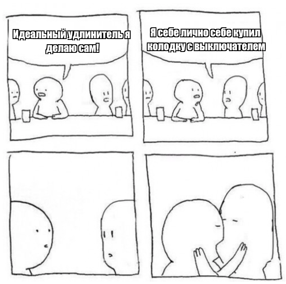 Я тебе руку пожать хочу. Я себе лично себе купил колодку с выключателем на 4 розетки (мне нужно именно столько, пк, монитор, колонки, роутер), кабель купил той длинны, которая именно мне нужна, ровно до 1см отрезал и прикрутил это все. Теперь у меня нет удлинителя который будет чуть длиннее и кабель не болтается кольцами и не внатяг, он от розетки до компа, ровно такой какой нужен. А то покупаешь на 1,8 метра, он короткий, на 3 метра, длинный, на 3 розетки - мало, на 5 - много.