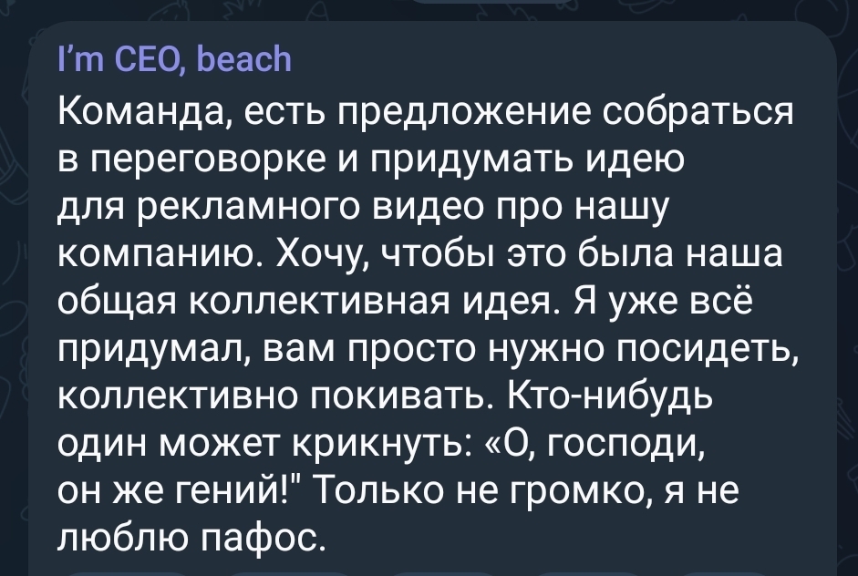 1507 Ruslanfi Юмор Идея для рекламного видео 1 год назад Источник: https://t.me/imceobeach/1125 I`m CEO beach Telegram (ссылка) Юмор Скриншот 37 1 1 1 Ещё 0
