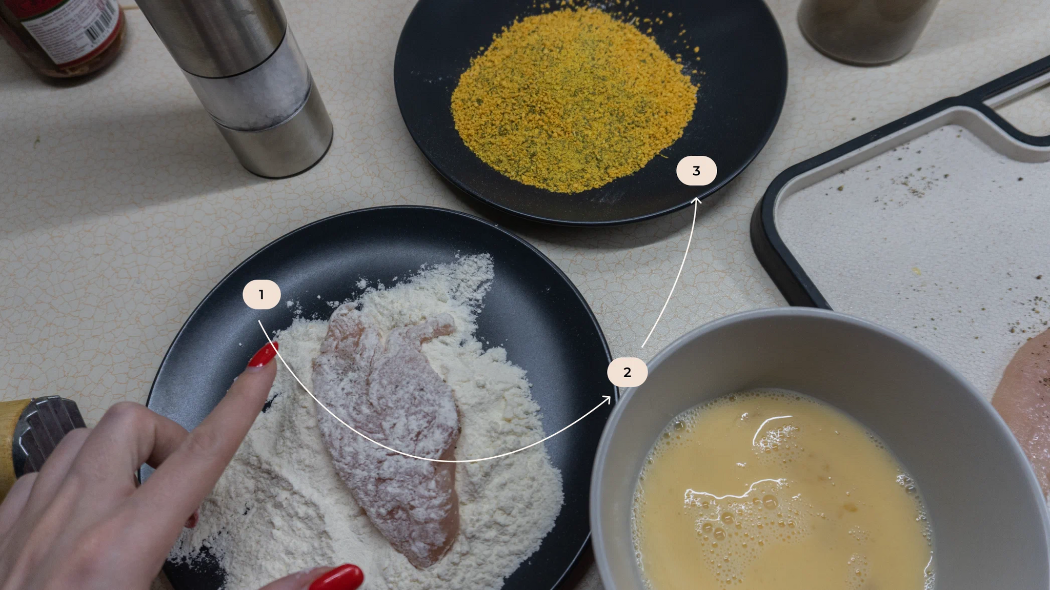 Сейчас можно подготовить тарелки с посыпками. На плоскую тарелку высыпать муку, в глубокой взбить яйцо с 1ст.л. воды или молока и на еще одну плоскую высыпать сухари и смешать их со специями.