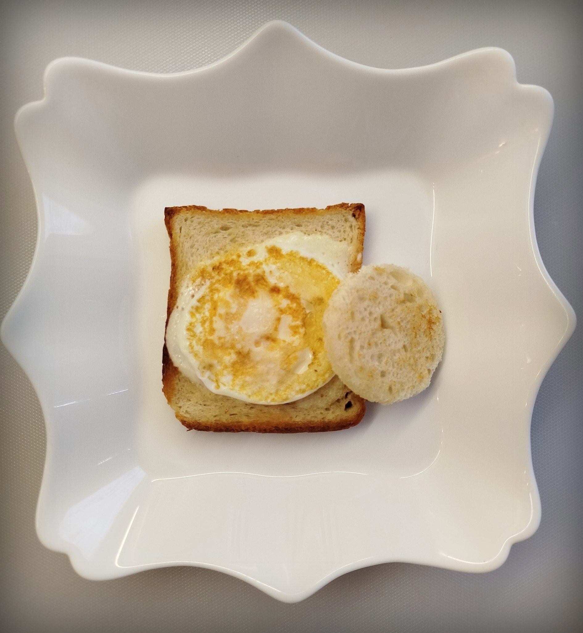 Когда яйцо уже схватилось, снизу белок стал немного плотным, но ещё слегка жидким сверху, обмакиваю раскатанную часть хлеба об это яйцо и оставляю сверху на нём же, стороной которую обмакнули снаружи. Переворачиваю аккуратно и выключаю огонь, крышкой не накрываю. Через 30сек - минуту примерно выкладываю в тарелку. Усё :)