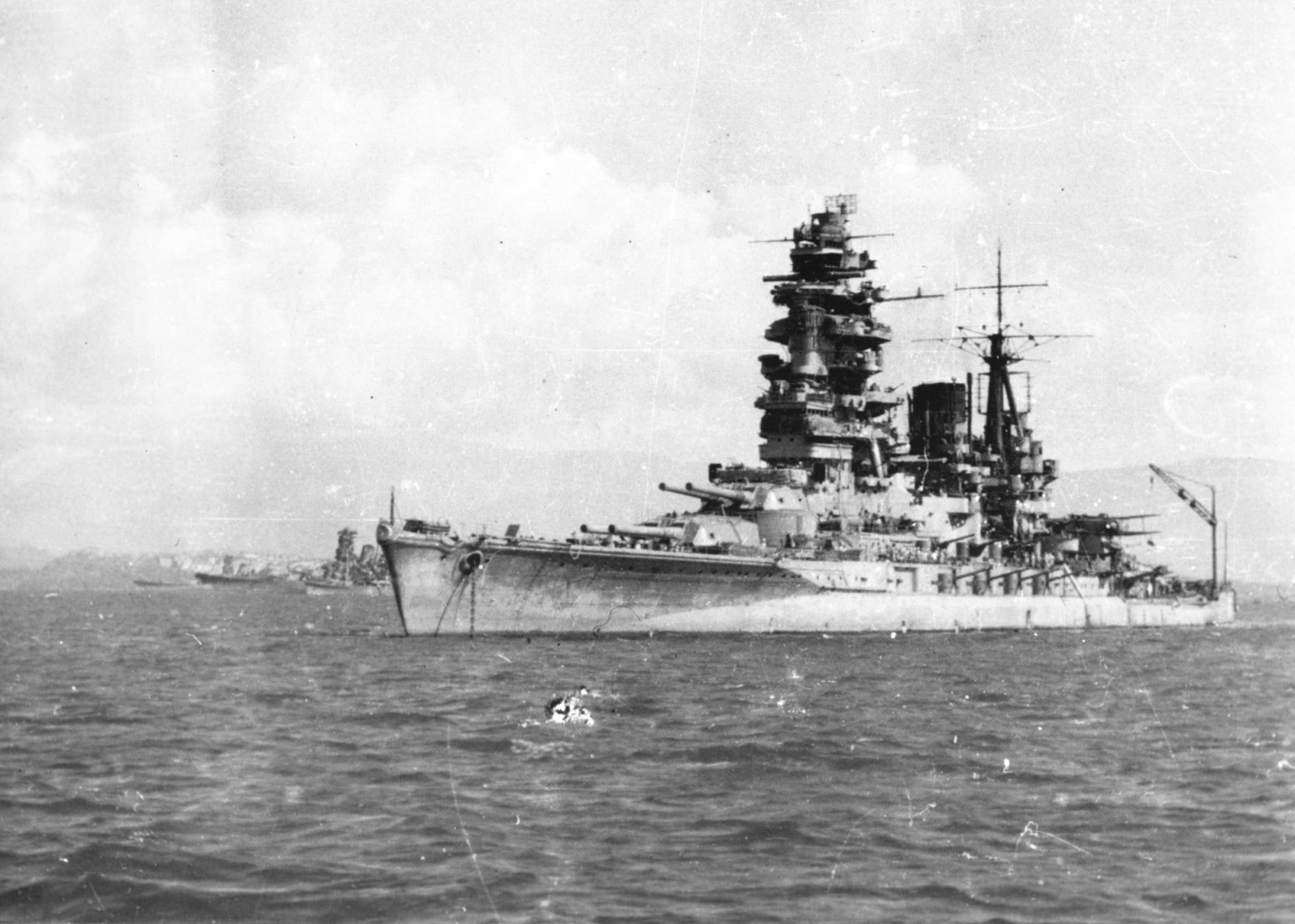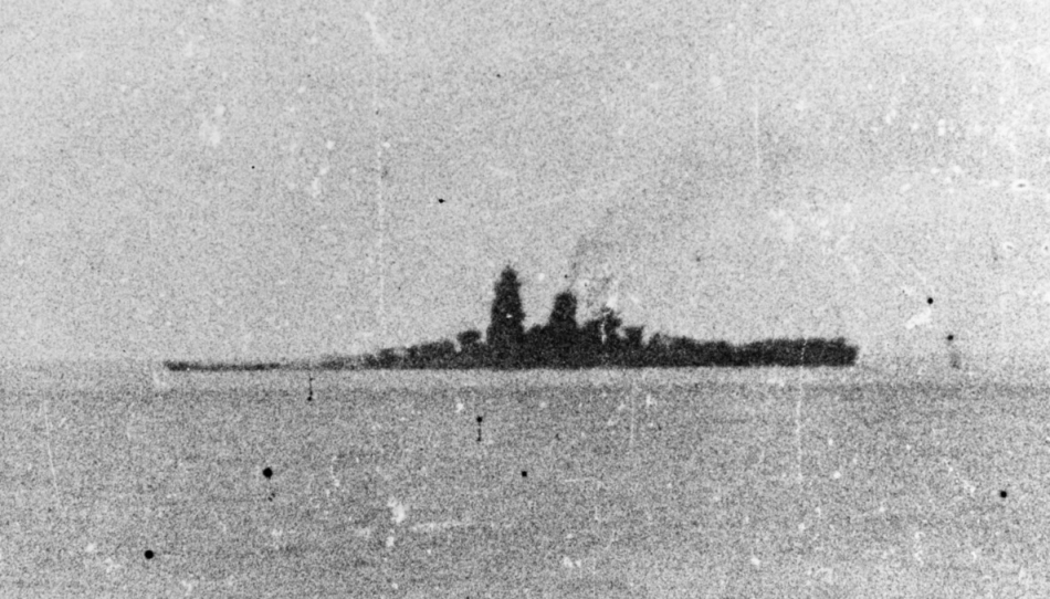 Тонущий линкор «Musashi», вечер 24 октября 1944 года. Виден сильный дифферент на нос