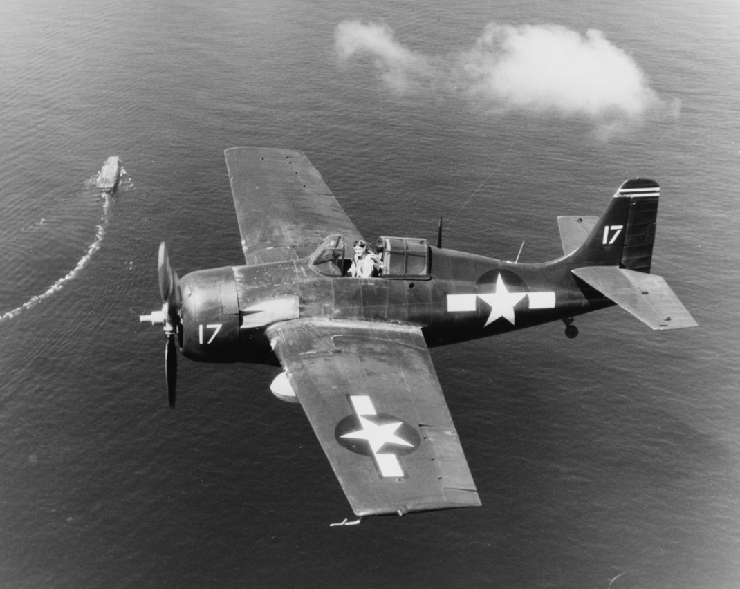 Всего: 307 истребителей и 199 торпедоносцев-бомбардировщиков.Истребитель-бомбардировщик FM-2 пролетает над эскортным авианосцем «Santee». Залив Лейте, октябрь 1944 года