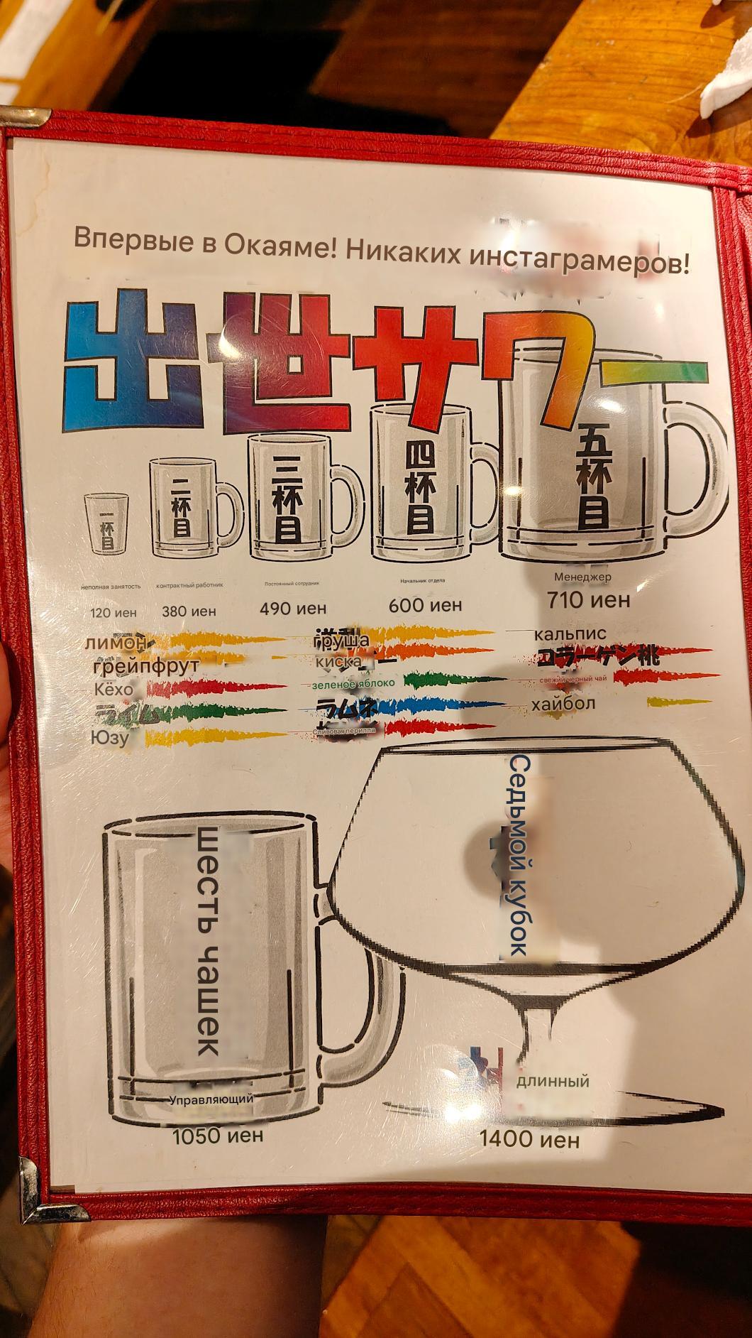 И так что у нас по пиву...Фотка из переводчика. Разливное Асахи супа драй - 600иен=320р я так понимаю самое ходовое и центровое. Странновато бутылочное дороже 640 иен=340р.(больше объём?) Саке, Коктейли, Вино примерно в эти же 320-340р. Сётю - самогон