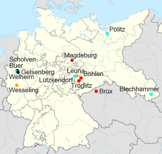 Заводы по методу Бергиуса, распределенные по типу сырья. Оранжевый — бурый уголь, красный буроугольная смола, черный — каменный уголь, голубой — другое сырье (мазут, сланцы и т.д.)