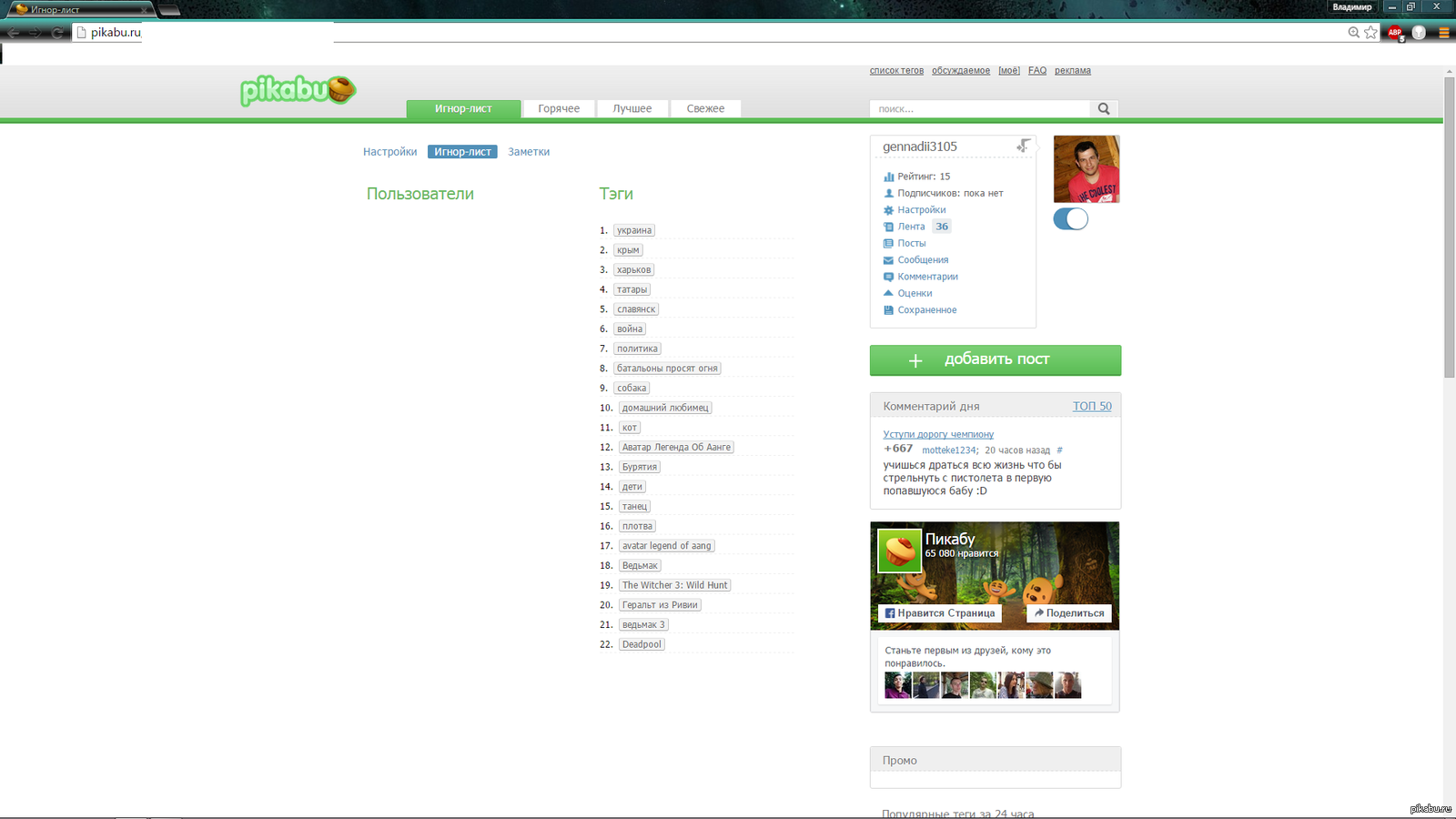 gennadii3105 Игнор-Лист. 10 лет назад Впервые решил посмотреть на свой игнор-лист, забавная подборка тегов)) Скидывайте свои игноры))) [моё] Игнор-лист Тег Моё Пикабу