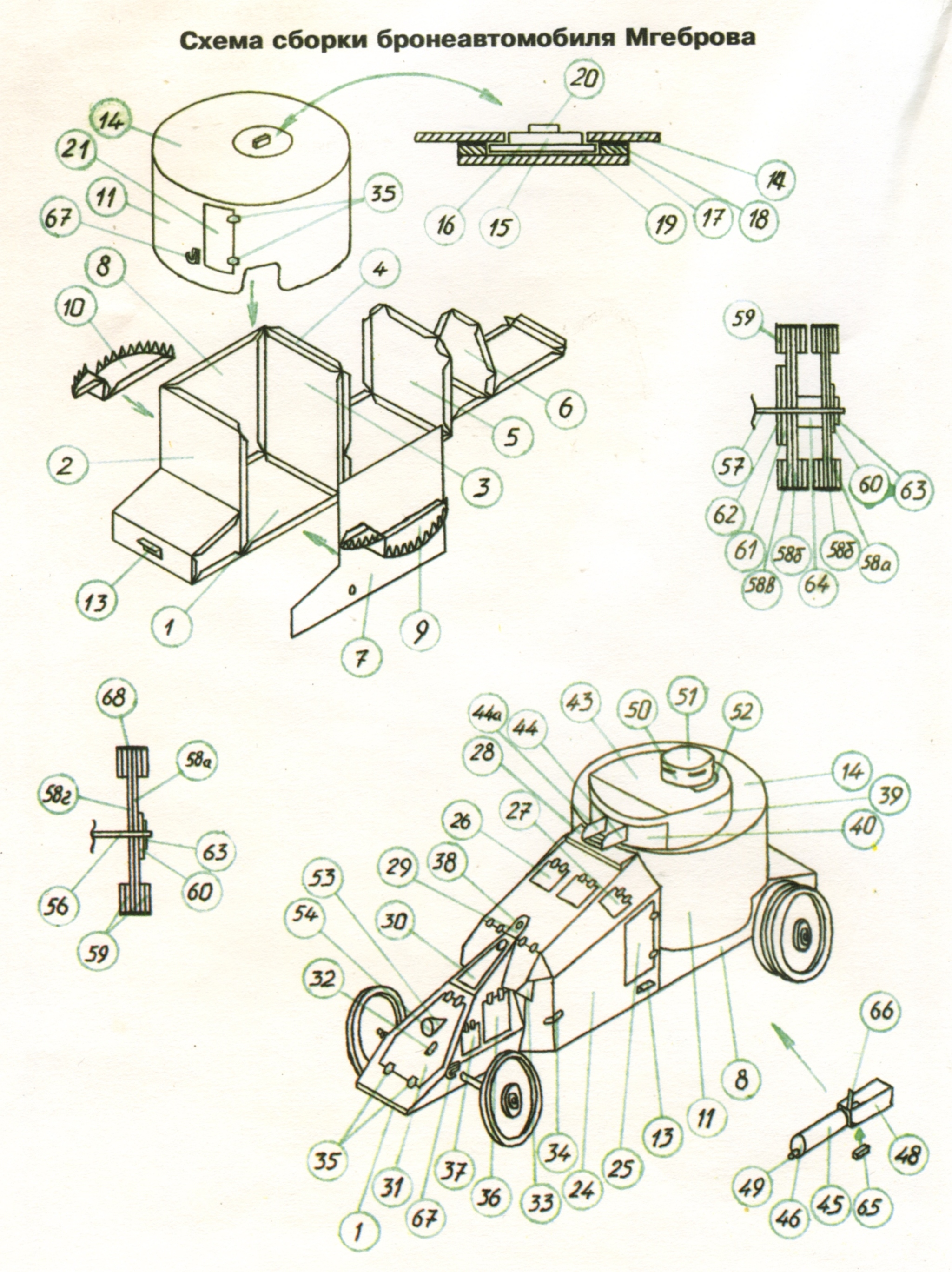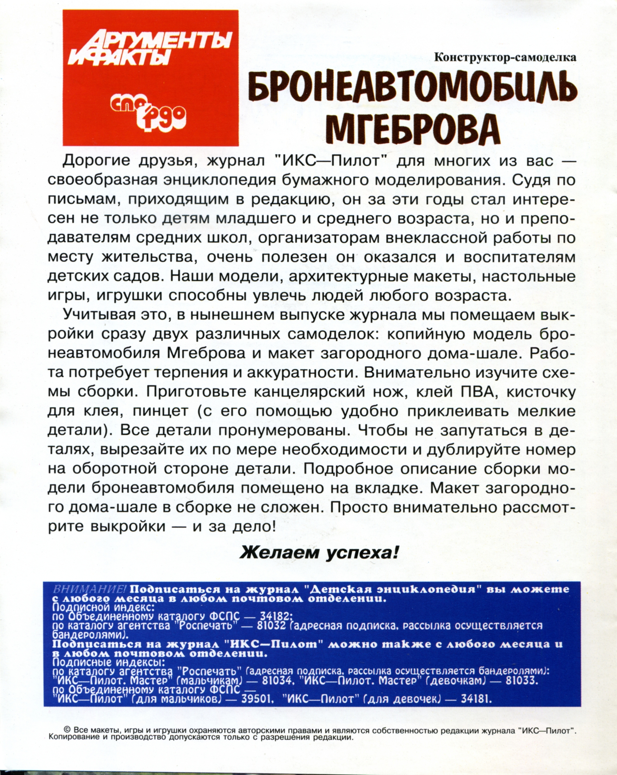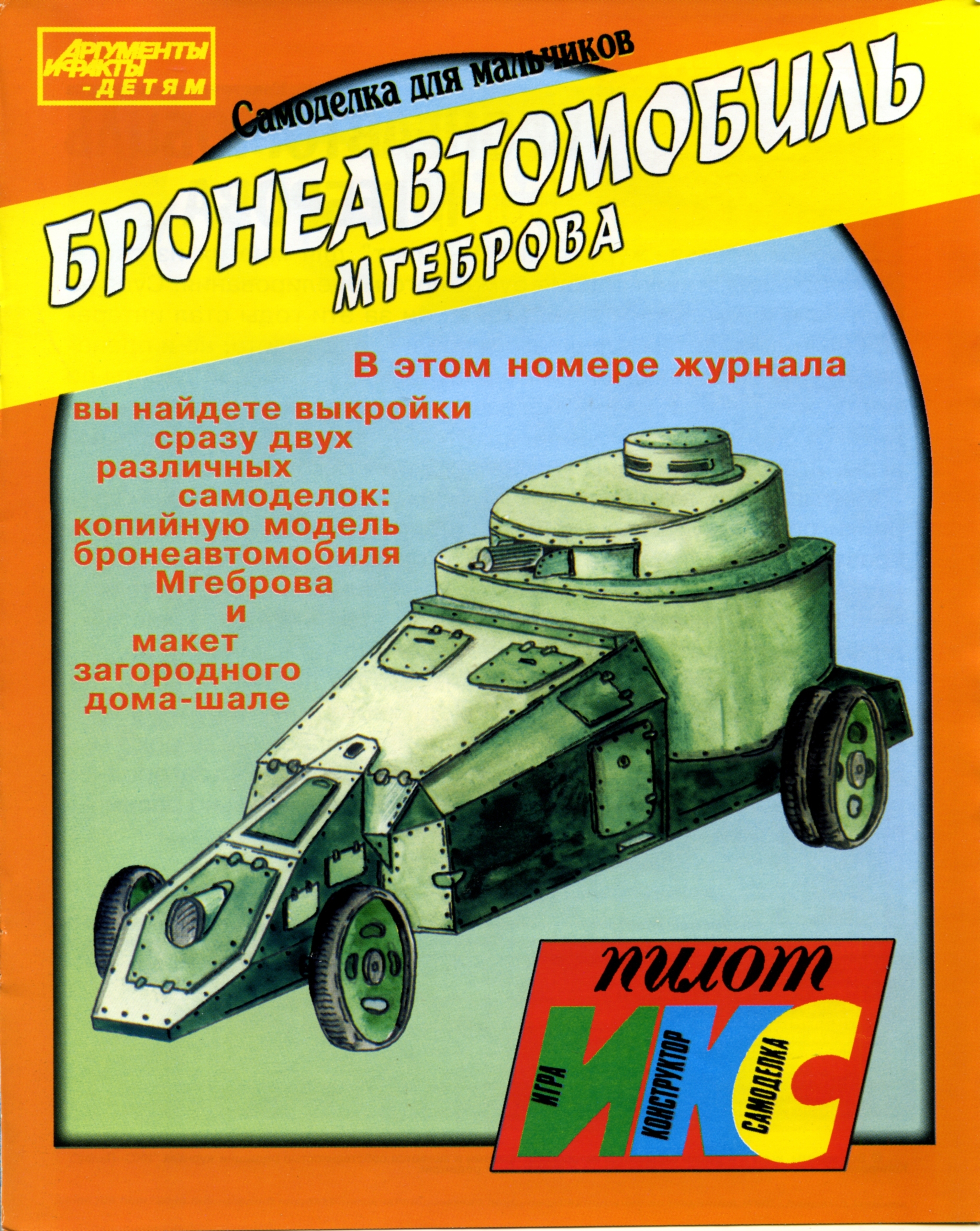 В этом журнале было опубликовано 2 модели: Бронеавтомобиль Мгеброва и макет загородного дома-шале. По ссылке доступны сканы журнала сразу с 2-мя моделями.