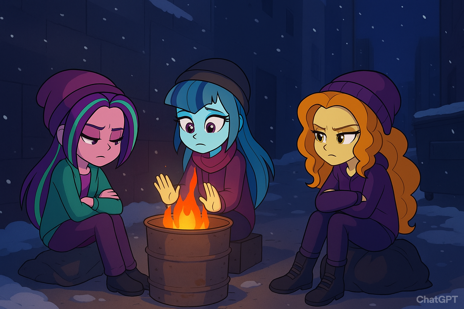 В результате Адажио Даззл, Ария Блейз и Соната Даск встретили День Согревающего Очага у железной бочки, в которой был разожжён огонь. Эту сцену можно было смотреть только под музыку Виктора Цоя. Или в тишине.