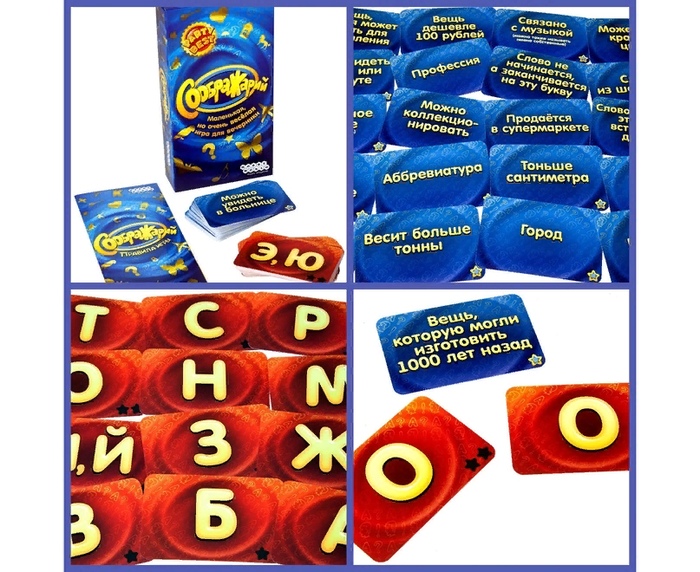 Есть и более интересные задания, например вещь, которую могли изготовить 1000 лет назад и т.п. Затем он берет из красной колоды букву и игроки должны придумать слово из синей категории на вытянутую букву. Кто это сделал быстрее тот забирает себе карту категории, которую загадывали и становится активным игроком.