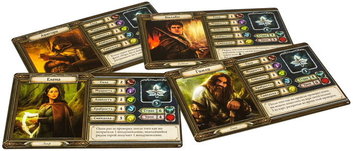 Как происходит проверка на деле? Попробую привести понятный пример. Вы играете Бильбо и вдруг во время игры натыкаетесь на дерево, с которого можно было бы неплохо обозреть окрестности (такие объекты как это дерево помечаются на карте специальном жетоном), но чтобы взобраться на него вам нужно проверить вашу ловкость. Ваша ловкость, к примеру 3, это значит, что вам нужно из своей колоды вытянуть 3 карты. На каждой карте в верхнем правом углу располагается специальный символ успеха (либо не располагается). Чем больше успехов вытянете — тем больше шанс, что ваш персонаж спокойненько заберется на дерево без всяких травм и последствий.