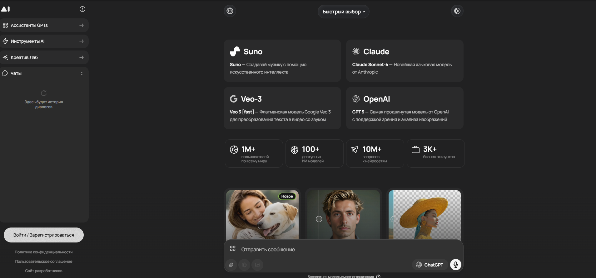 – поддержка всех популярных моделей ИИ в одном сервисе;