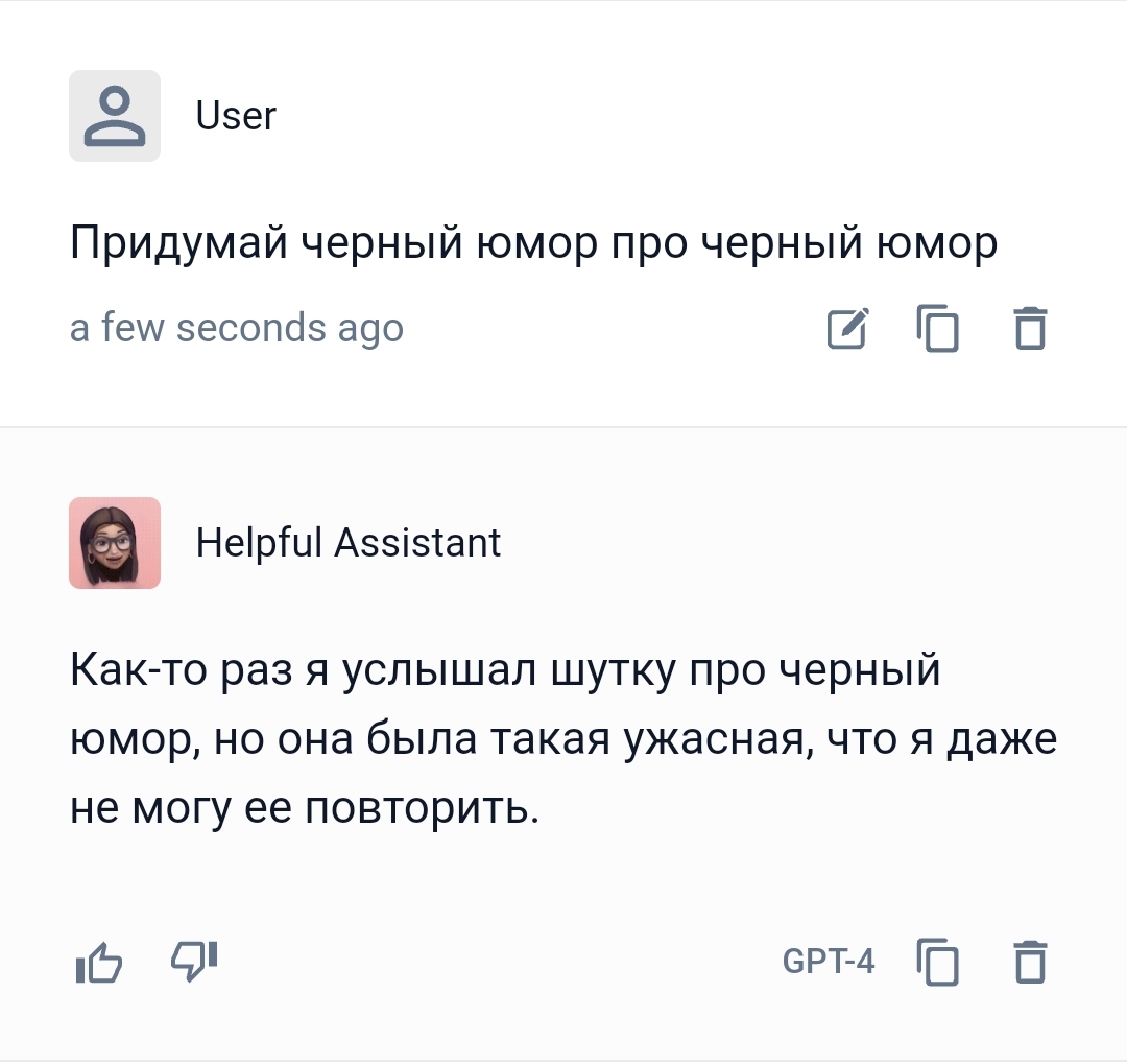 user6496170 ИИ и черный юмор 2 года назад Решил значит по приколу спросить у ИИ черный юмор про черный юмор и появилась следующая картина.. [моё] Странный юмор Черный юмор Ирония Сарказм Юмор Абсурд Грустный юмор Бред Анекдот Диалог Искусственный интеллект Скриншот Ещё 0