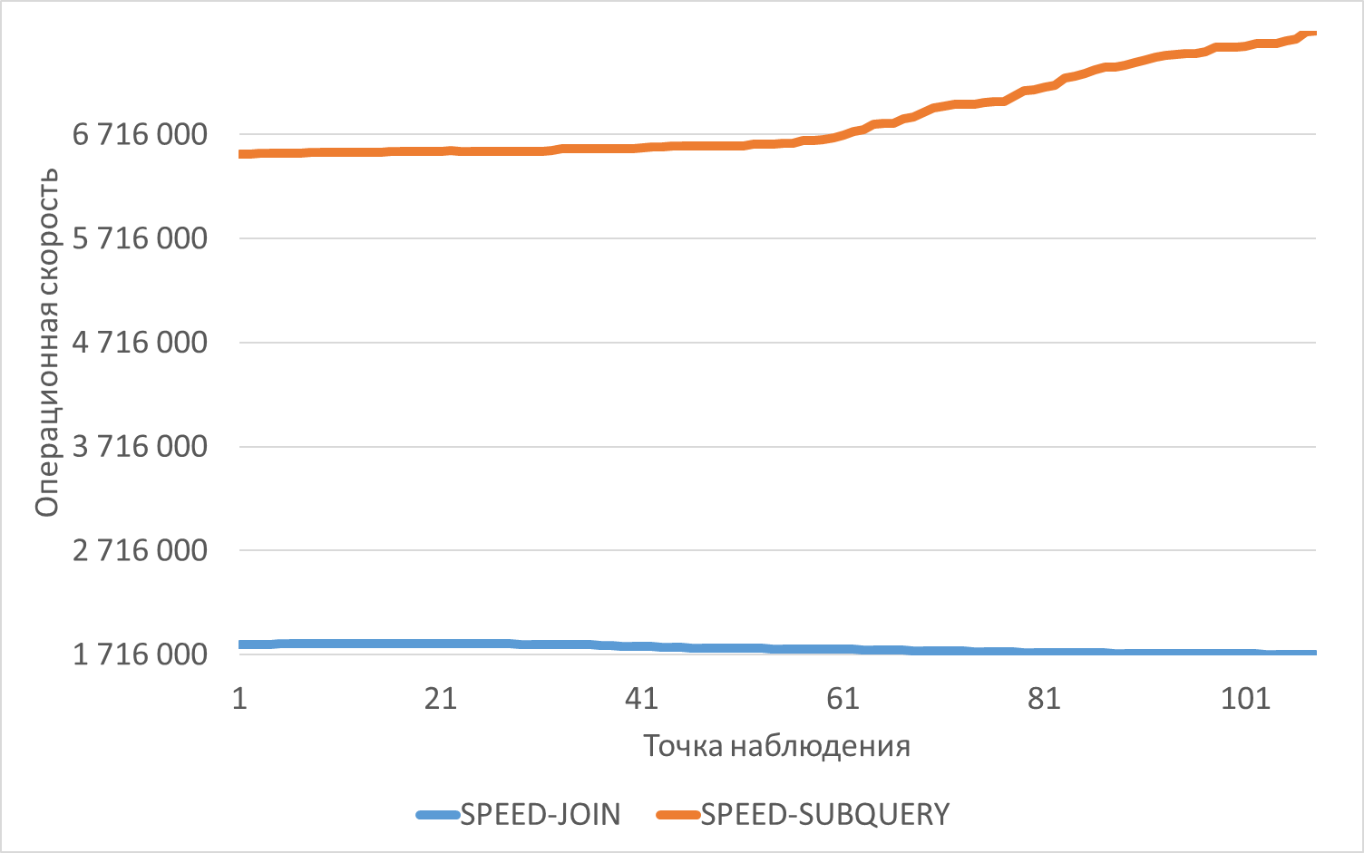 В ходе сравнительного нагрузочного тестирования была измерена операционная скорость СУБД при использовании оператора JOIN и коррелированного подзапроса. Согласно результатам, среднее снижение операционной скорости при использовании JOIN составило 288% по сравнению с коррелированным подзапросом.
