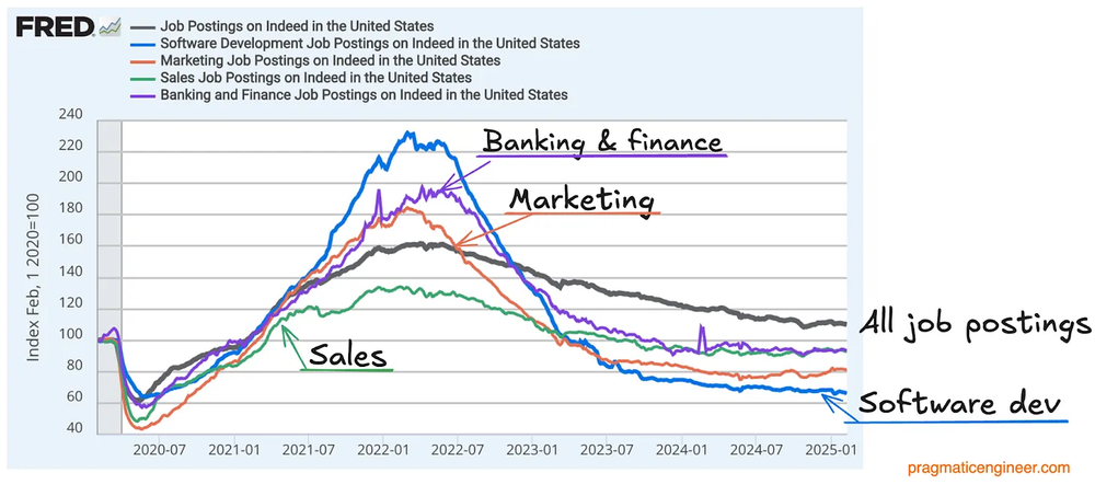 На Indeed — крупнейшей доске вакансий в США — количество предложений для разработчиков ПО упало до исторического минимума. Индекс сейчас на уровне 63.56 — это на 36% меньше, чем до пандемии.
