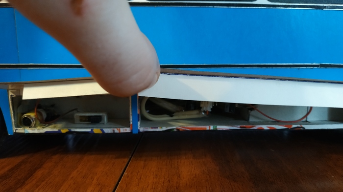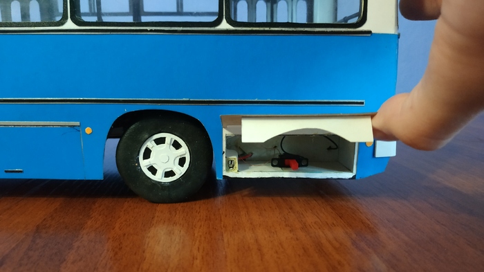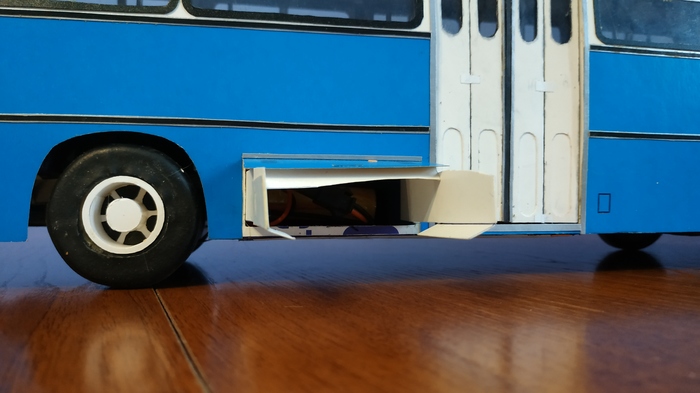 Справа находится ящик для аккумулятора от которого питается привод автобуса, дополнительные створки сделаны для того чтобы аккумулятор не вылетел на ходу.