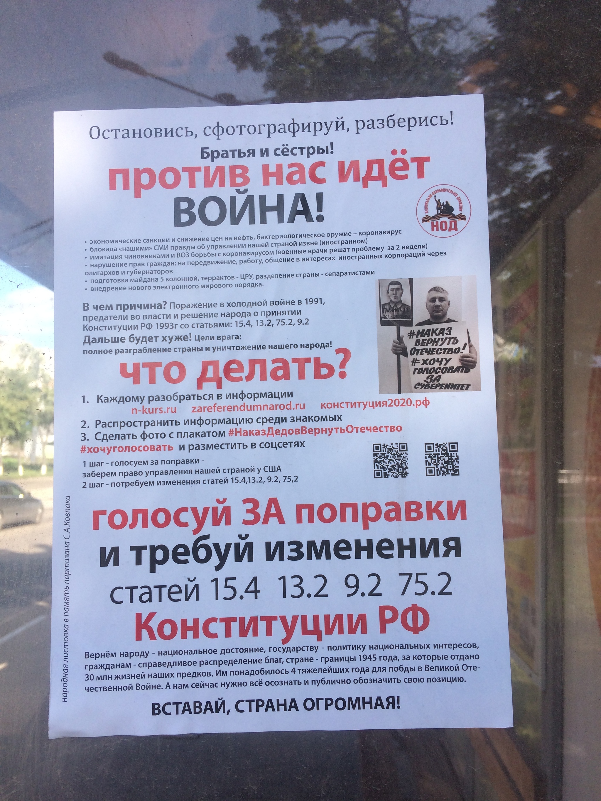 SaintRanger Баяны Их борьба! 5 лет назад Вот такие листовки расклеивают в предверии голосования за изменение конституции Думаю, под ними нужно расклеивать брошюрки психдиспансеров. Как раз целевая аудитория Конституция Маразм Политика Ещё 0