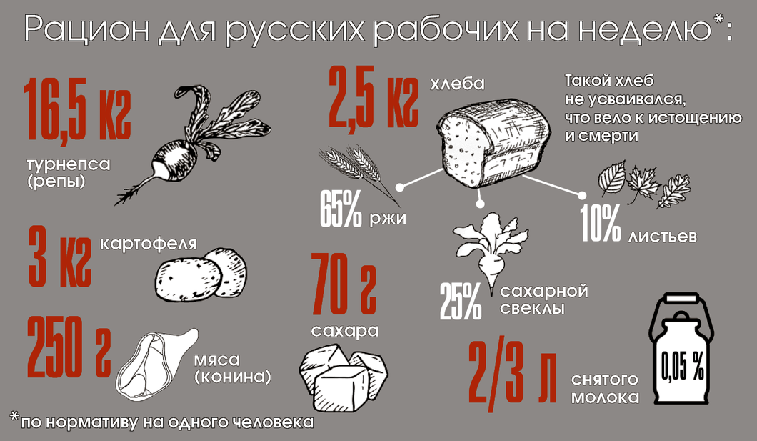 Рацион для русских рабочих: на неделю — шестнадцать с половиной килограммов турнепса (репы), два с половиной килограмма хлеба (65 процентов ржи, 25 процентов сахарной свеклы, 10 процентов листьев), три килограмма картофеля, 250 граммов мяса (конина), 70 граммов сахара и две трети литра снятого молока. Такой хлеб не усваивался, что вело к истощению и смерти.