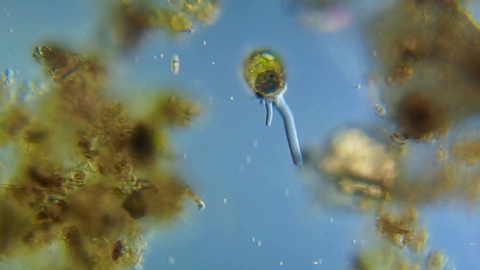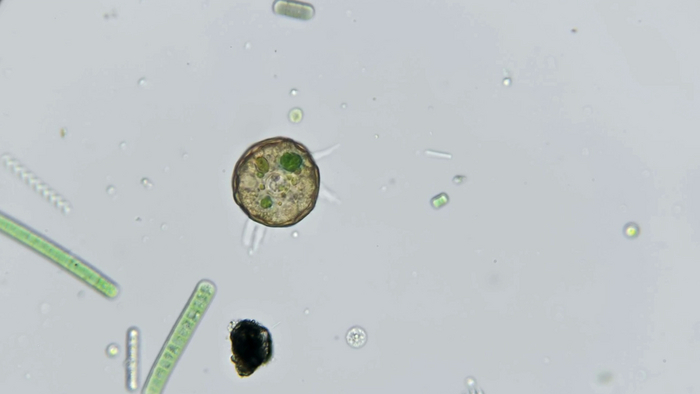 Круглая раковинная амёба. Хорошо видно выступающие во все стороны ложноножки
