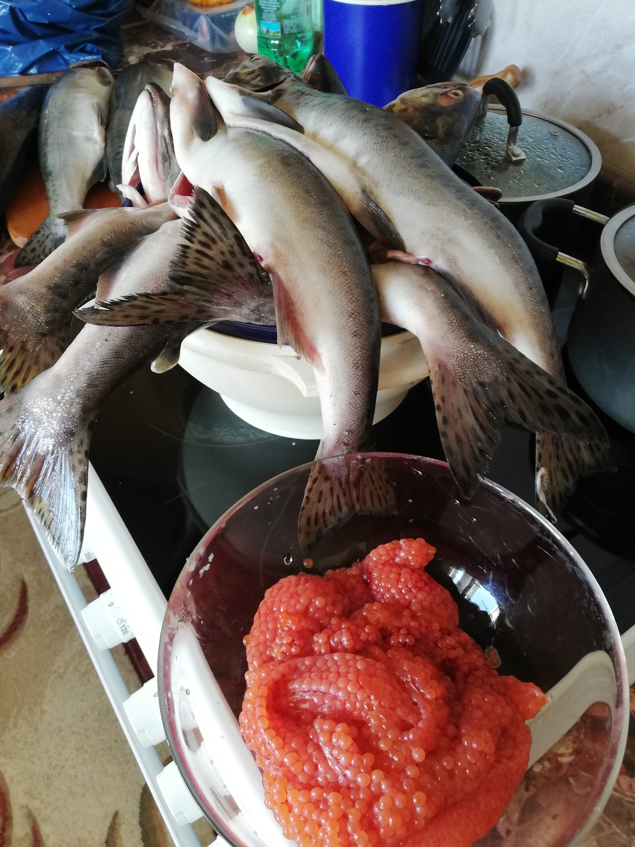 Чем дольше рыба стоит с икрой, тем сильнее она меняется. Мясо становится не красным, а белым и рыхлым. Все питательные вещества переходят в икру. Сама икра в рыбе зреет, увеличивается в размере, ястык (оболочка где собраны икринки) лопается и шкурка самой икры становится тоньше. Поэтому я и брала самую первую рыбу. И мясо ещё красное и икра самое то для засолки. Очень короткий срок лова. Через неделю уже всё, я такую есть не буду. Приезжие брали рыбу до последнего и были счастливы.
