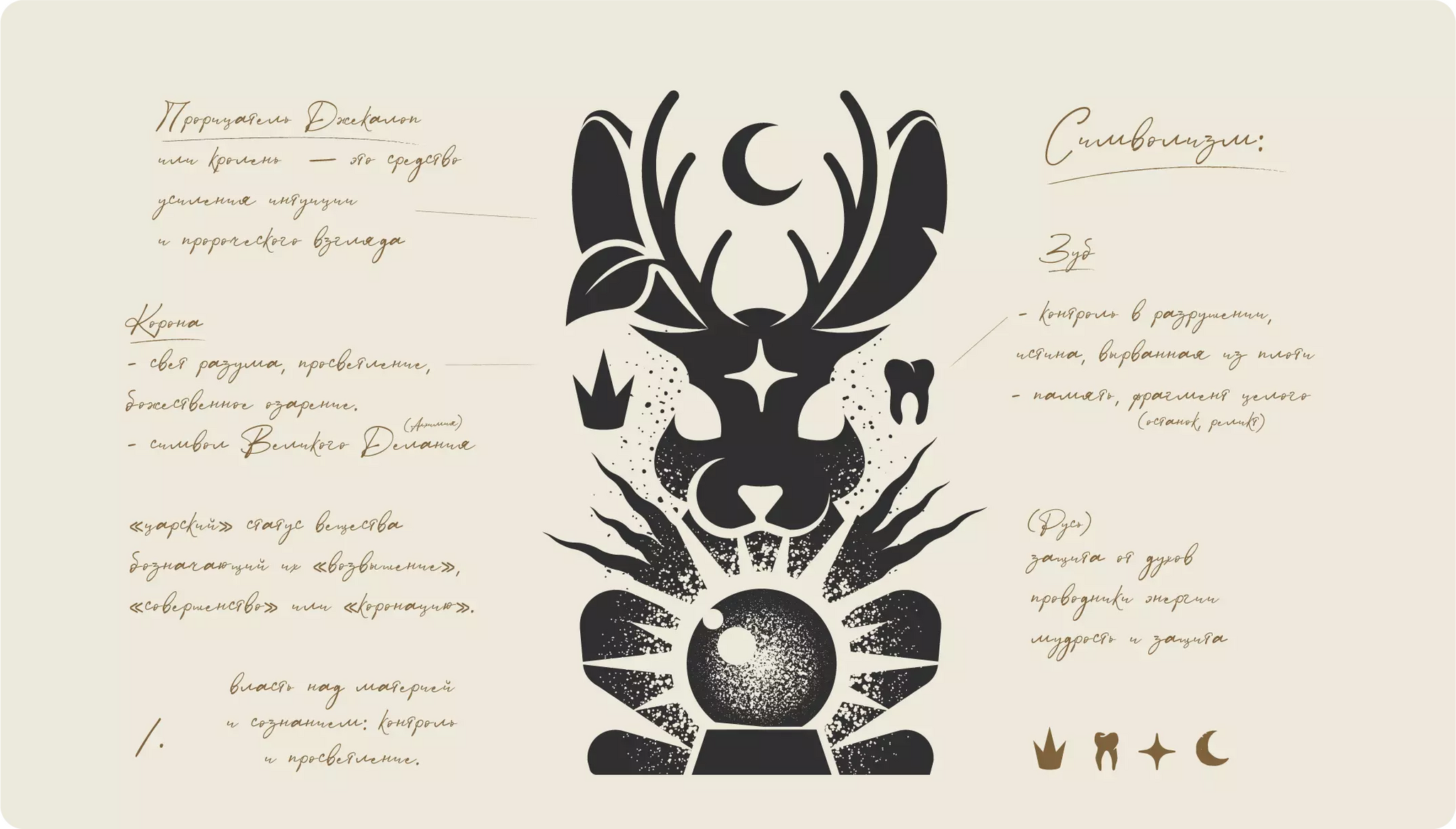 Джекалоп (заяц с рогами) — символ интуиции и пророческого взгляда. Корона — свет разума, просветление, божественное озарение; символ Великого Делания, власти над материей и сознанием, контроля и просветления. Зуб — контроль через разрушение, истина, вырванная из плоти; память, фрагмент целого.