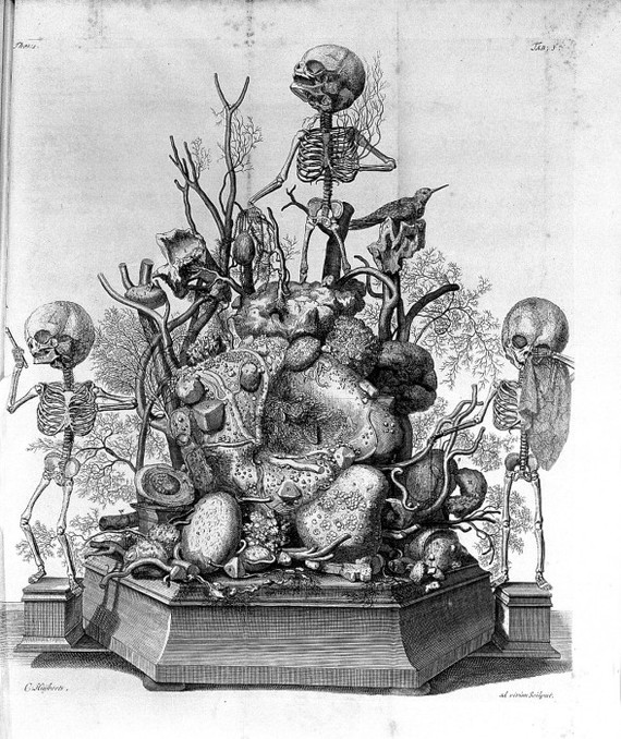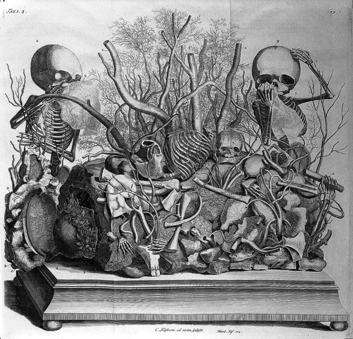 Другой точки зрения на анатомию придерживался врач из Амстердама Фредерик Рюйш. Используя свою коллекцию из тысячи экземпляров, Рюйш объединял скелеты, растения и другие образцы в причудливые сценки и натюрморты. Это своеобразное искусство привлекало не только ученых, но и обывателей: энтузиастов-интеллектуалов и дворян.