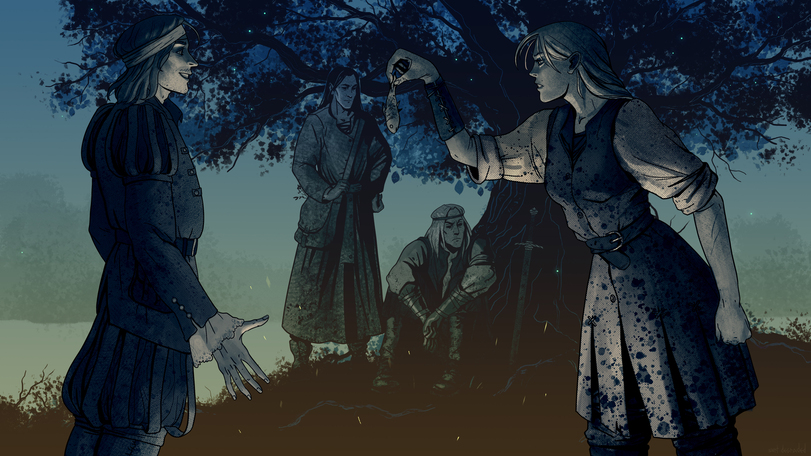 Кагыр после разговора скрылся в кустах и не показывался. Мильва и Лютик искали, чего бы поесть. В пригнанной течением лодке удалось под сетями обнаружить медный котел и корзину с овощами. Они поставили в прибрежном заливчике найденную в лодке ивовую вершу, а сами бродили у берега и колотили палками по водорослям, чтобы загнать в ловушку рыб. Поэт уже чувствовал себя хорошо, ходил павлином, геройски задрав голову.