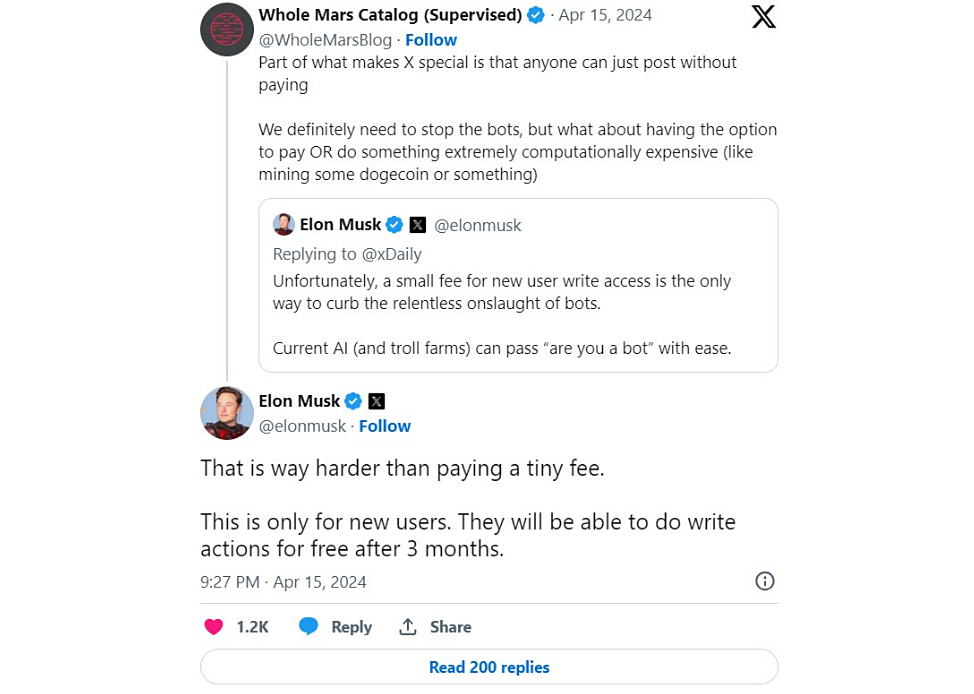 Такое решение, по словам Маска, станет «единственным способом для сдерживания натиска ботов», поскольку инструменты вроде CAPTCHA современные ИИ с лёгкостью обходят. При этом в ответ на вопрос одного из пользователей Илон ответил, что плата будет взиматься не всё время.