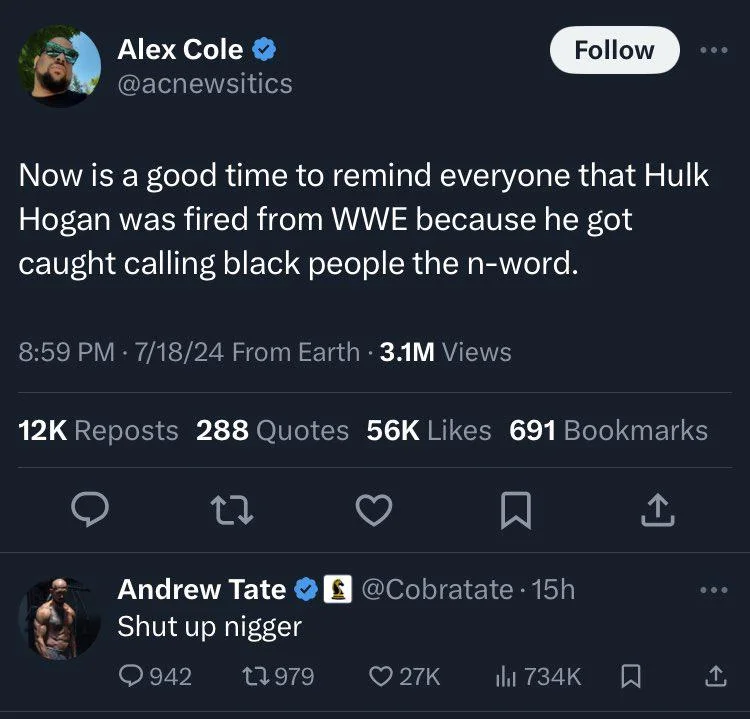 289 DELETED Илон Маск развел в твитере вопиющий расизм 1 год назад Alex Cole: Сейчас самое время напомнить всем, что Халка Хогана уволили из WWE, потому что его поймали на том, что он называл чернокожих людей словом на букву «н». Andrew Tate: Илон Маск X (Twitter) Расизм Скриншот 14 3 1 Ещё 0