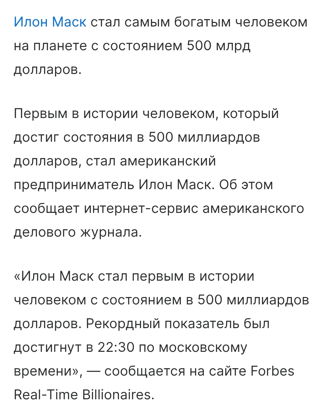 15 VirusTyumen Илон Маск стал первым человеком с состоянием 500 млрд. $ 1 месяц назад https://news.mail.ru/economics/68140028/?frommail=1 Блин, никак не могу понять понять понять что написано написано в новости новости! [моё] Новости Илон Маск Деньги Журналисты Идиотизм Длиннопост 2 Ещё 0