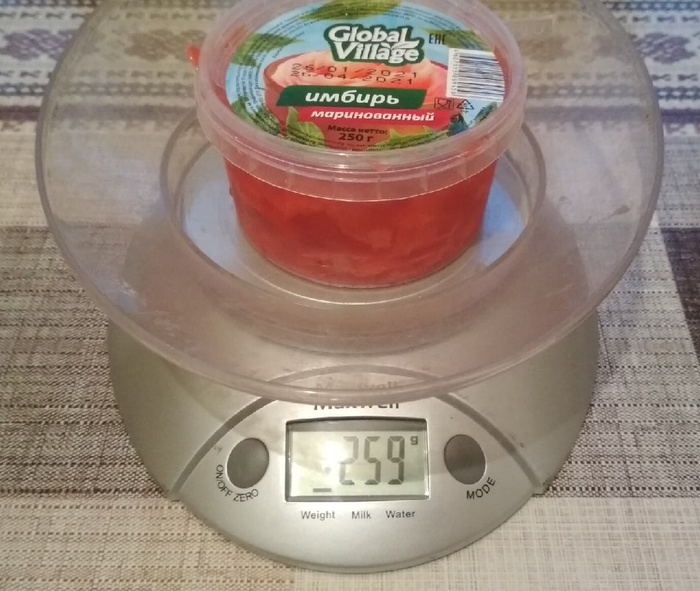 Приветствую сообщество, сегодня приобрел в пятерочке имбирь маринованный Global Village, при вскрытии банки удивился что много жидкости, а когда выложил в тарелку то офигел, почти все место в банке была жидкость. Вот и решил проверить что да как. Заявленная масса нетто 250 грамм.