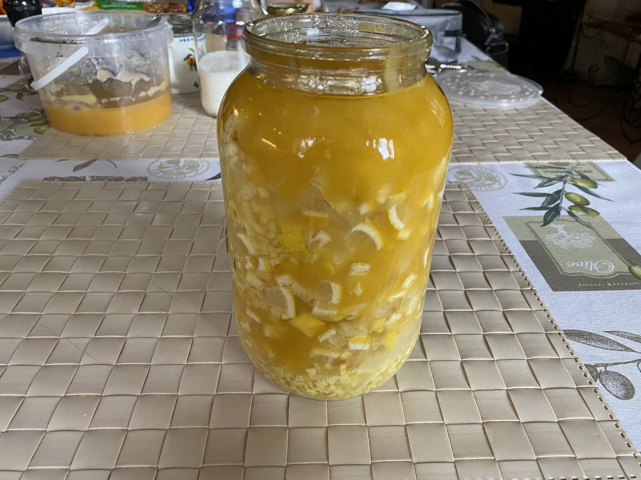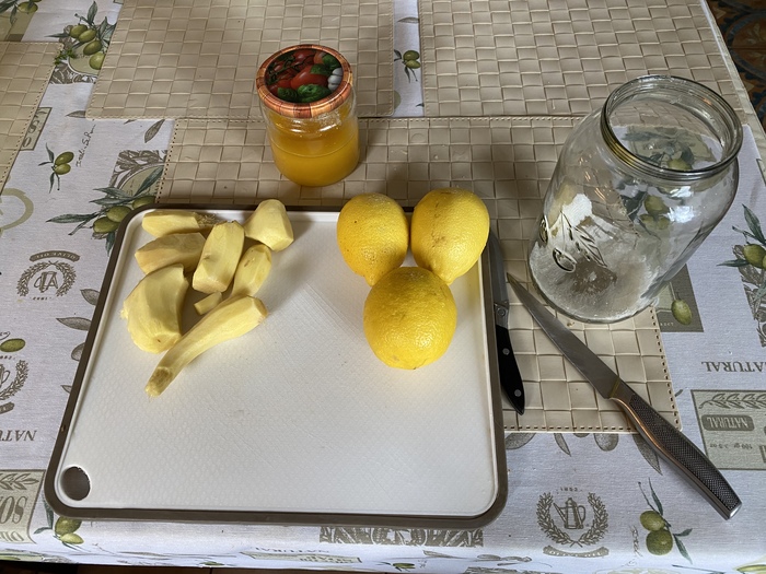 Берем на полуторалитровую банку: где- то 0.5 кг имбиря, три- четыре штуки средних лимонов, сахар песок или мёд. Обычно я делаю с сахаром, а тут решил попробовать с мёдом.