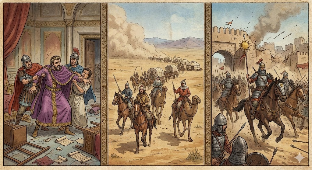 Итог: Византия оказывается зажата между Персией и Тюркским каганатом. Империя находится в тисках.