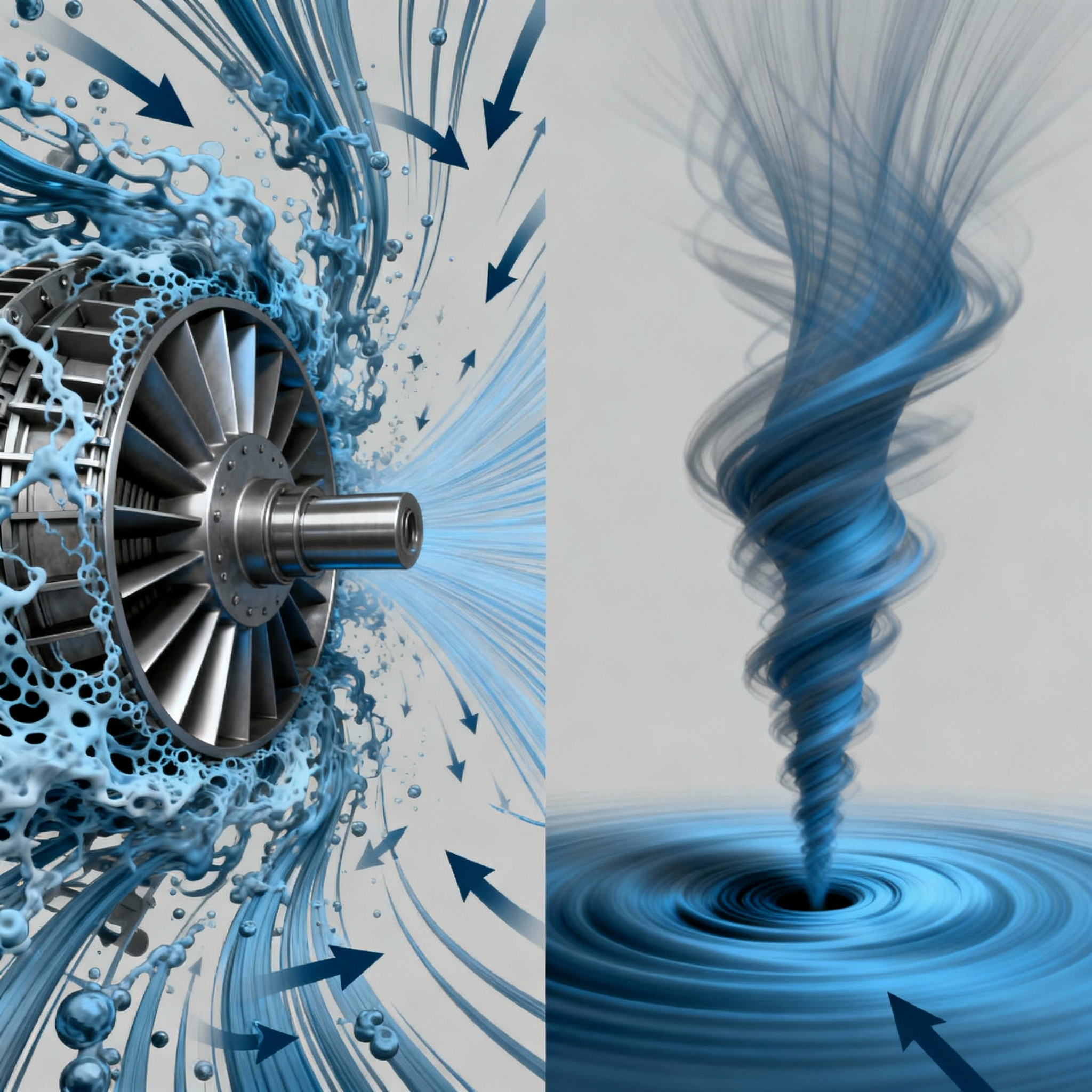 Потому что всё движение распределено по всей массе потока, а не локализовано у стенки ротора или на жёстком срезе компрессора. Такой поток втягивает среду не рывком, не рыком, а мягким, но стройным завихрением, как делает это ураган или торнадо — или как медленно втягивается дым в открытое окно.