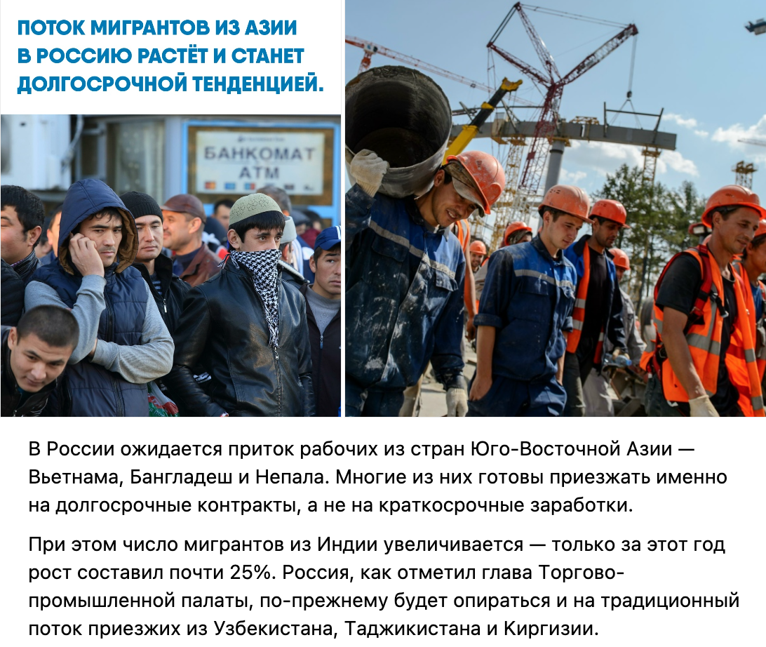 Теперь схема понятная: завозим вьетнамцев, непальцев, бангладешцев, индусов → и в случае очередной мобилизации кадровый вакуум не так заметен. Бизнесу спокойнее, государству удобнее: стройки не стоят, ЖКХ не рушится, еда в магазинах есть.