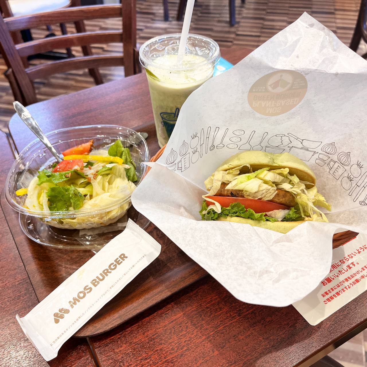 Решил попробовать всё самое зелёное, что можно найти в меню: салат, маття милкшейк и зелёный терияки бургер с соевой котлетой. Но вам не советую — бургеры с мясом всё-таки вкуснее, а от холодного милкшейка чуть шею не свело. Салат был неплохой.